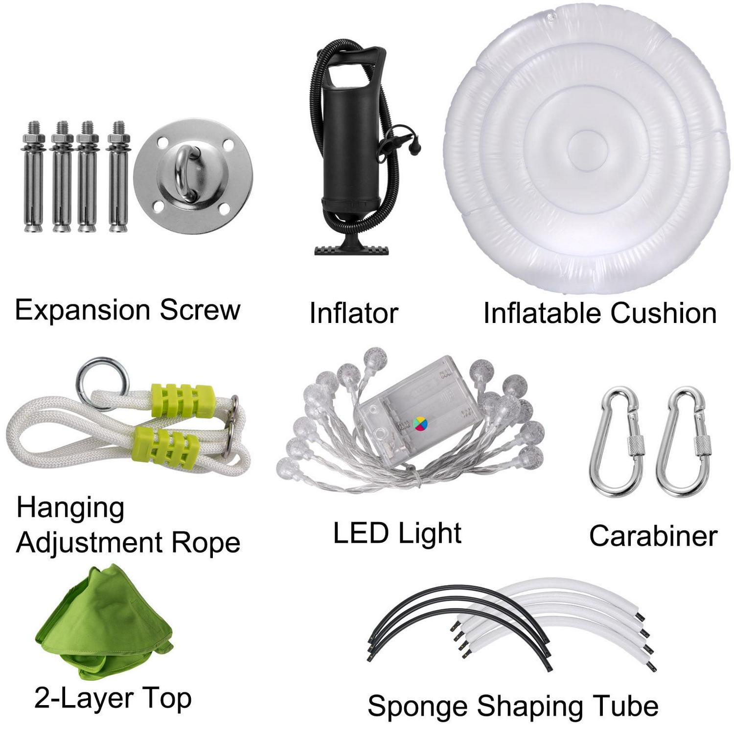 – Assemble in Minutes: You can hang this tent under a tree to enjoy the cool shade and feel the summer vibes of nature. Of course, you could also hang it indoors from a ceiling or a hammock metal stand to read or relax in the winter. Besides, it comes with a hanging hardware kit, including adjustable hanging ropes, carabiners, a two-layer tent top, inflator, sponge shaping tubes, and expansion screws. Everything you need is provided. Get ready to enjoy your vacation without ever having to leave your house.