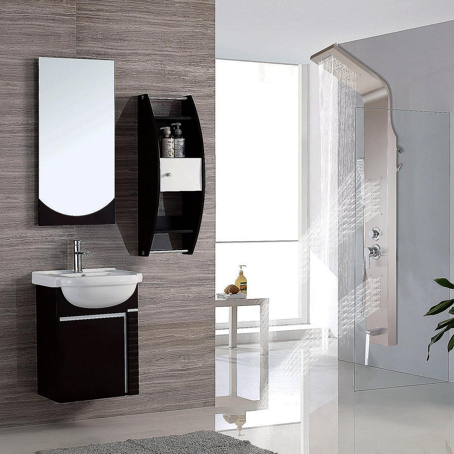 There are two shower heads at the top for free choice of rainfall or waterfall shower modes. Two massage jets with tiny rubber holes are set in the middle of the panel, while the water spout offers more convenience for washing.
