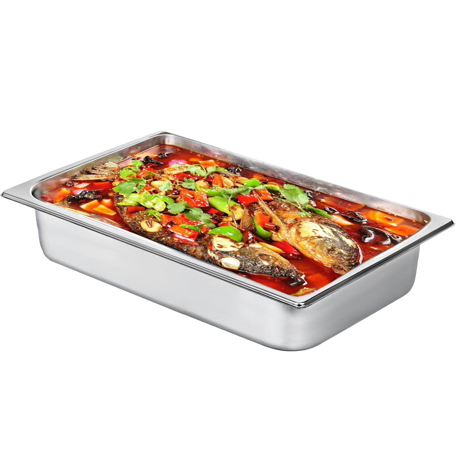 Product Description Premium Quality Easily serve your sides and entrees in these large steam table pans. Our pans were carefully designed with strength, durability, and quality in mind. We worked diligently to create something you would be proud to use in any setting. Large Capacity With the 4″ deep and 13 L/13.7. Quart capacity, ideal for holding meats, side dishes, fruits, and practically any type of food. Easily handle daily use, busy kitchens, and high-volume buffet service and catering. Safe Durable Professionals will be happy to hear our steam table pans can hold both hot and cold food. Heats food evenly to 500 Fahrenheit. The superior fit and heating efficiency helps to extend holding times, allowing your serving staff to spend more time with your guests and less time swapping out trays. Reinforced Corner The reinforced corner design gives strength and allows space between pans for easy removal. Rounded corners protect you from scratches and nicks. Easy Cleaning Using electrolytic polishing technology, smooth and delicate, not easy to hide dirt. Integrated design, no welding, and gaps make it simple to clean and maintain. Multi-Purpose These multi-purpose steam table pans allow for better food release– no more scorched portions that take hours of soaking or scrubbing to clean. They are tough and hold their shape when dropped or mishandled by busy kitchen crews. Suitable for catering party portions, broiling, baking, cakes, pies, etc. Specifications Material: Stainless Steel Capacity: 13 L/13.7 Quart Quantity: 6 Packs Food Pan Thickness: 22Gauge/ 0.03 inch Overall Size: 530 x 325 x 100 mm/20.9 x 12.8 x 3.9 inch Item Weight: 937 g/ 2 lbs Package Content 6 x Hotel Pans