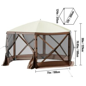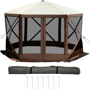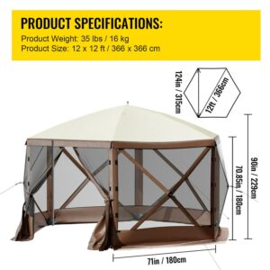 VEVORbrand Camping Gazebo Tent, 12’x12′, 6 Sided Pop-up Canopy Screen Tent for 8 Person Camping, Waterproof Screen Shelter w/Portable Storage Bag, Ground Stakes, Mesh Windows, Brown and Beige
