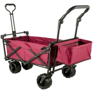 The red utility folding wagon cart with detachable canopy and all-terrain wheels is made of waterproof 600D oxford cloth and sturdy steel frame. The 360-degree rotating off-road wheel is adopted to make your parking, pushing, and pulling more smoothly. Larger storage space, extra storage basket, and two mesh bags provide additional storage space. It can be opened and folded up easily in seconds.