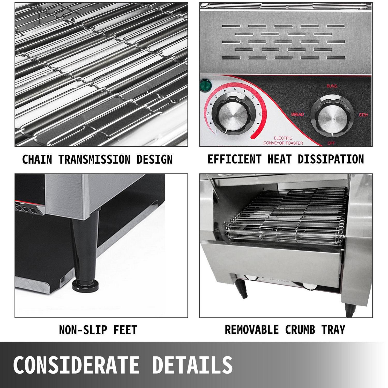 – EXQUISITE DETAILS – Removable crumb tray for easy cleaning. The commercial bread toaster is equipped with the heat emission holes, ensures good heat dissipation. Premium chain net adopted, which can transport the bread quickly and smoothly.