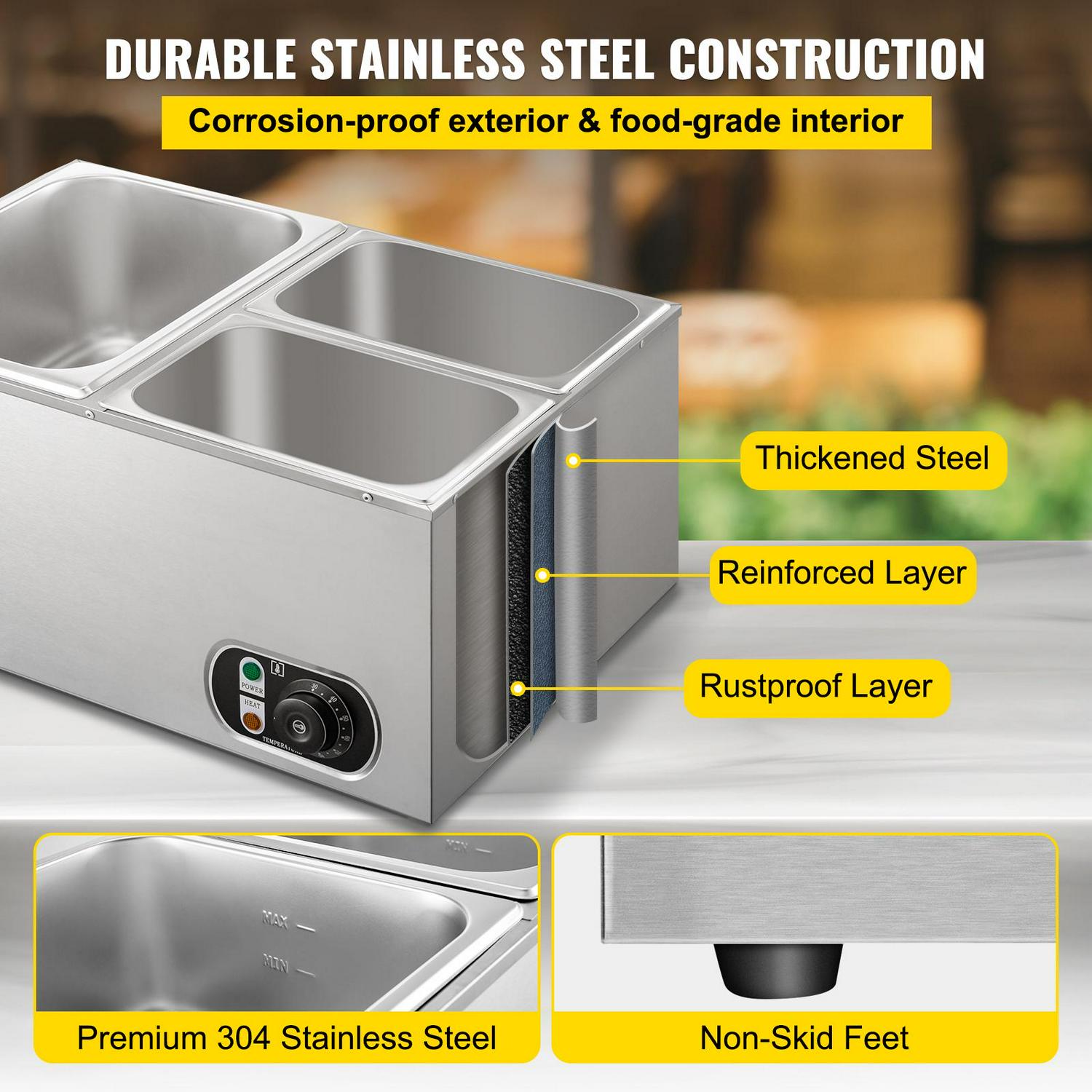 This food well features 1500 watts of power for outstanding heating potential, and its all 304 stainless steel construction solid and robust, ensuring long-lasting durability.