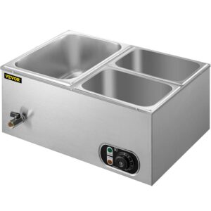 VEVORbrand Commercial Food Warmer 1×1/2GN and 2×1/4GN, 3-Pan Stainless Steel Bain Marie 24Qt,1500W Steam Table 15cm/6inch Deep,Temp. 86-185a Electric Soup Warmer with Lids and 2 Ladles