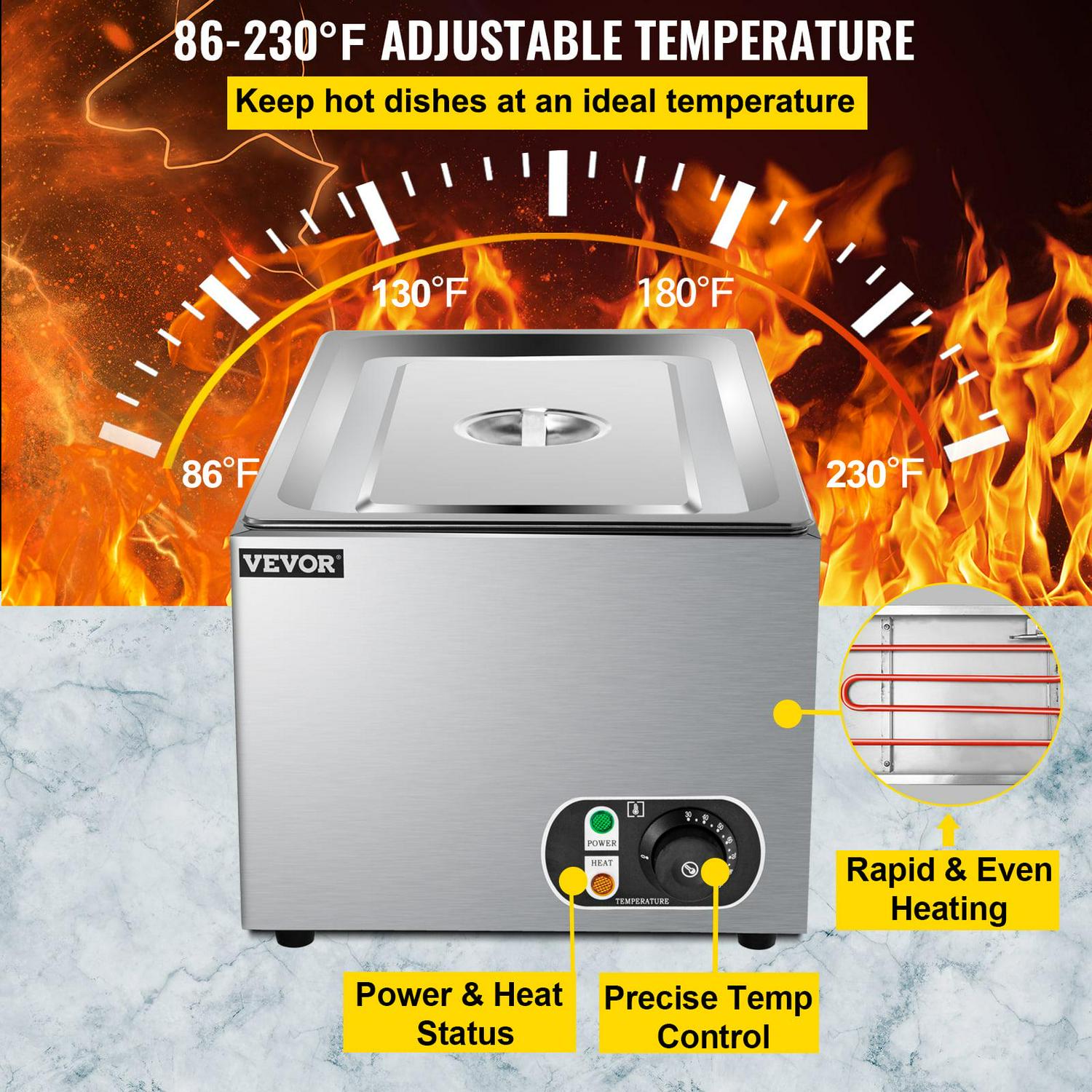 This commercial food warmer has a 27 qt capacity pan and can contain a more considerable amount of food at one time. It possesses a thermostatic knob in the range of 86 to 230 (30 to 110 ), ensuring the food taste. It is equipped with an efficient heating tube for rapid and even heating. It is a sturdy and durable food warmer featuring nonslip feet, a practical lid, and two extra-offering ladles. This steam table warmer is the best choice for various home and commercial use.