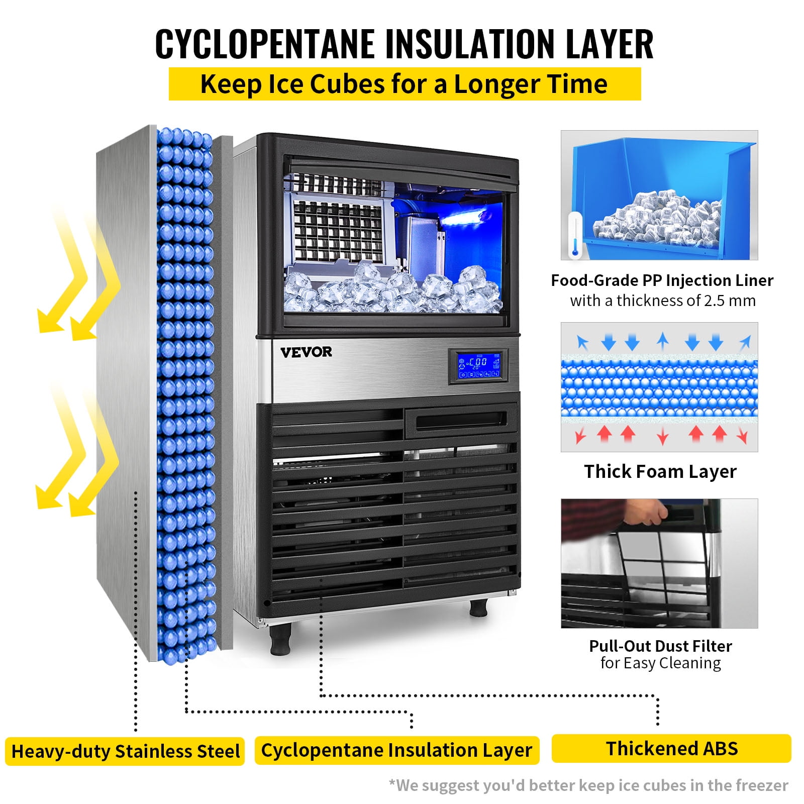 - Unmatched Insulation Performance: Our commercial ice maker machine takes insulation to a whole new level. It features a thickened cyclopentane insulation material and a 0.4 mm SUS410 stainless steel exterior that’s built to last and effectively isolate external heat. Even when the machine takes a break, your ice cubes stay frosty for a remarkable 6-8 hours. Get ready to redefine chill with our insulation masterpiece!