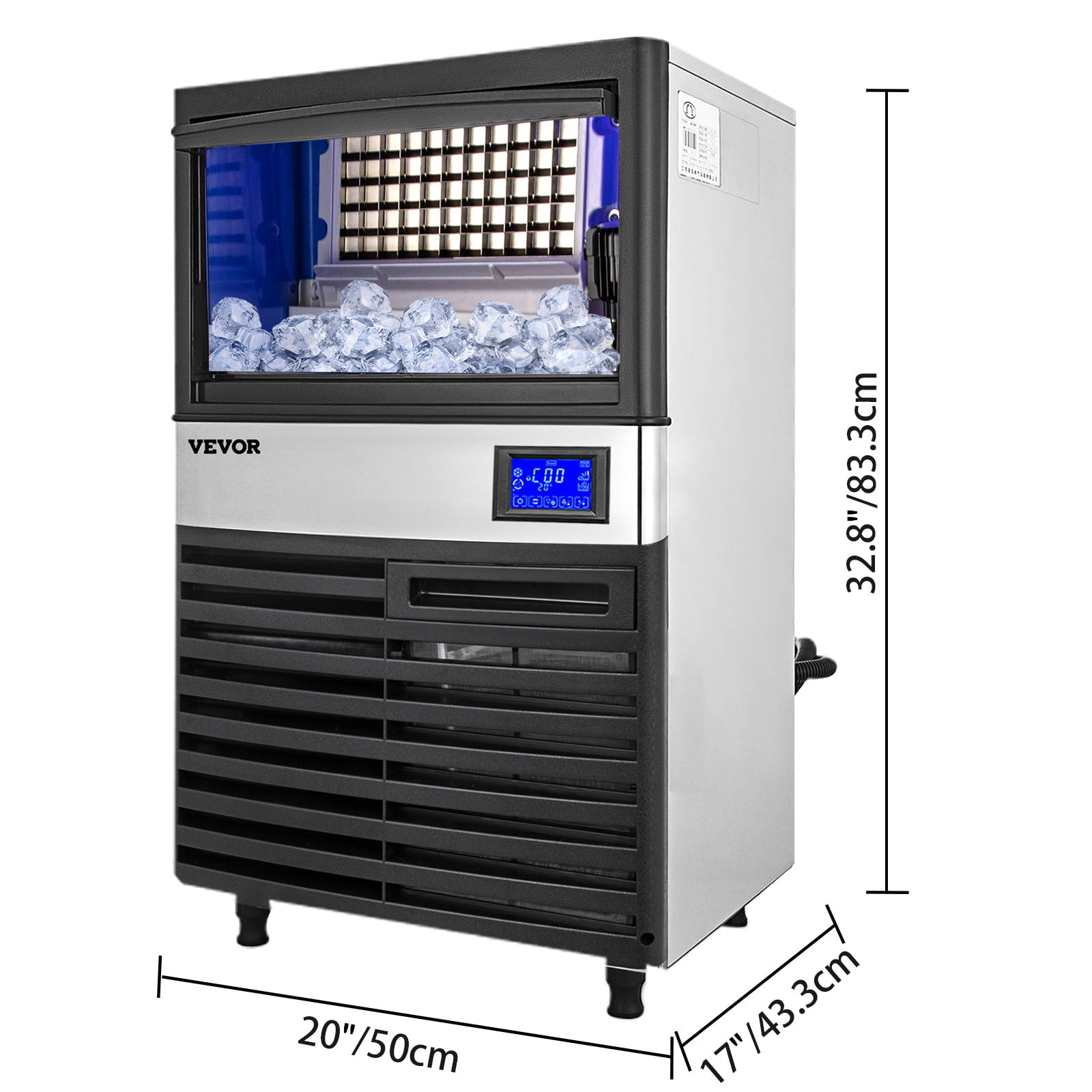 Our light commercial ice maker produces 160 lbs of ice cubes daily. In actual test conditions, ice production capacity is up to 162.7 lbs/24 h at 21°C/70°F, 10°C/50°F ambient/water temperature. It has a maximum ice storage capacity of 66 lbs and can keep your ice insulated for up to 8 hours.