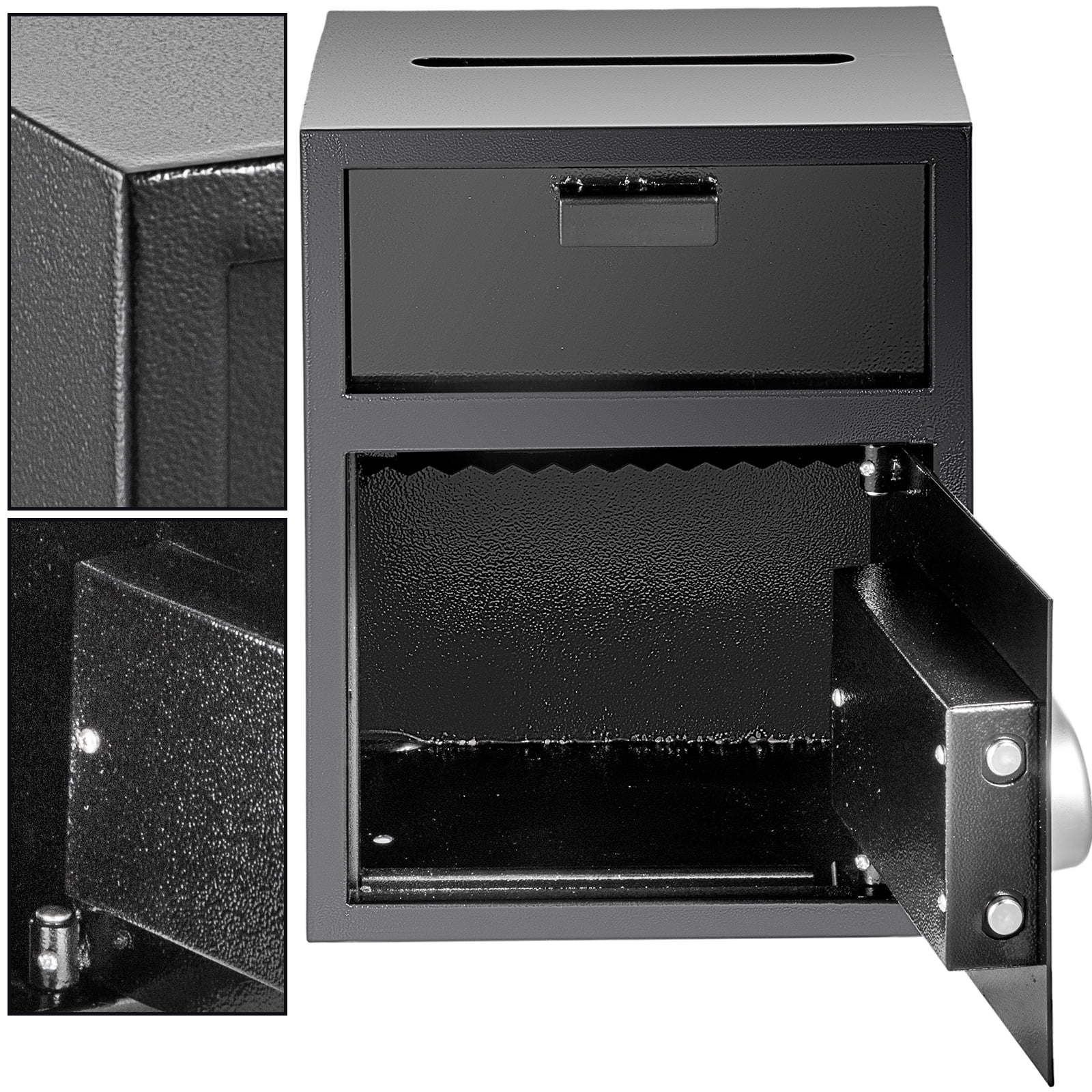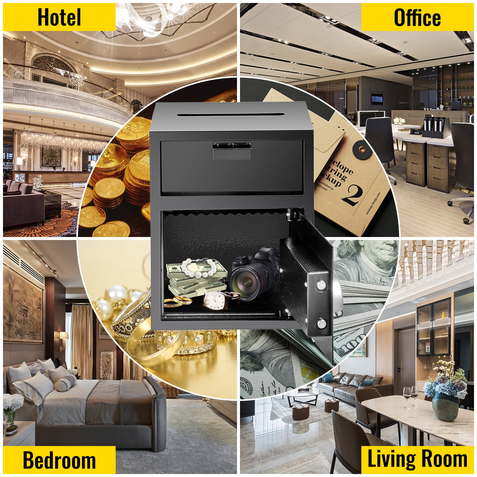 Brand Introduction VEVORbrand is a leading brand that specializes in equipment and tools. Along with thousands of motivated employees,VEVORbrand is dedicated to providing our customers with tough equipment & tools at incredibly s. Today, VEVORbrand has occupied markets of more than 200 countries with 10 million plus global members. Why Choose VEVORbrand? 1.Tough Quality Assurance 2.Incredibly s 3.Fast & Secure Delivery 4.30-Day Free Returns 5.24/7 Professional Customer Service Product Description Digital Depository Safe with Drop Slot The safe with deposit slot is constructed with high-quality carbon steel, making it sturdy and durable. The money drop safe adopts the advanced electronic code lock, featuring excellent sensitivity and pry-resistant bolts. It also comes with two keys for emergency use. The safe with deposit slot is convenient to install and ideal for storing guns, jewelry, cash, important documents, etc. Carbon Steel Material The small deposit safe is made of sturdy carbon steel, with lock bolts and hidden hinges for durable and secure use. The interior is padded to protect the items from damage. Digital & Key Access An electronic code lock is adopted in this safe drop box, which is more secure than a mechanical lock. It comes with two keys in case of forgetting the password or power shortage. LCD Screen The safe with money slot is equipped with an LCD screen, which scans the electronic lock system automatically and displays the status of locking, unlocking, and power shortage. Deposit Slot & Drawer A deposit slot is added on the drop box safe’s top, making it convenient to store cash and documents. The deposit drawer is located at the front and works as a post office box. Pry-Proof Locking Bolts The safe for money is designed with two thick solid lock bolts, which can effectively improve the theft-proof performance due to the large lock control surface. Wide Application The cash drop safe is widely used to store guns, important documents, jewelry, cash, and other valuables. It is perfect for home, hotel, office, shop, restaurant, etc. Specifications Material: Carbon Steel External Size (L*W*H): 14.17″x11.81″x17.72″/36x30x45 cm Internal Size (L*W*H): 10″x10″x16.54″/25.4×25.4×42 cm Door Thickness: 0.12″/3 mm Box Body Thickness: 0.05″/1.2 mm Color: Black PackageContent 1 x Drop Safe 2 x Keys 4 x Expansion Screws 1 x Manual