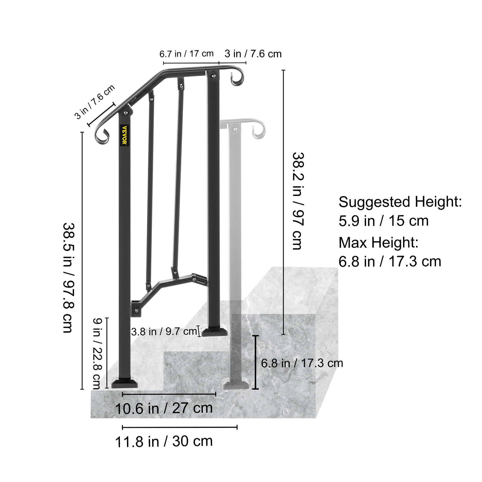 Brand Introduction VEVORbrand is a leading brand that specializes in equipment and tools. Along with thousands of motivated employees,VEVORbrand is dedicated to providing our customers with tough equipment & tools at incredibly low prices. Today, VEVORbrand has occupied markets of more than 200 countries with 10 million plus global members. Why Choose VEVORbrand? 1.Tough Quality Assurance 2.Incredibly Low Prices 3.Fast & Secure Delivery 4.30-Day Free Returns 5.24/7 Professional Customer Service Product Description Handrail Picket #1 Fits 1 Step This matte black handrail is one Picket #1 Handrail that fits for 1 step. It is an elegant handrail that’s a comfortable fit for any budget. Constructed with real iron metal and adopted powder coating technology, it is suitable for gardens, residential buildings, commercial office buildings, hotels, etc. Fit 1 Step This is one Picket #1 Handrail for 1 step. This handrail will cover: 1 Risers 2″ to 5.9″ Tall, Picket #1 measures 5.9″ center-to-center of posts. Real Iron Metal This handrail is constructed with real wrought iron, not aluminum. It is more strong and reliable and will not fail or bend like aluminum. Also, iron post mounts will not rust or flex. Powder Coating Technology Adopted powder coating technology, the handrail picket is designed to be matte black. It is rustproof for durability and easy to clean. Reliable & Stylish Design All the connections are strongly welded and perfectly connected. The iron picket and curved design is beautiful and stylish. Easy To Assemble The handrail includes all necessary assembly and installation hardware. Universal Application The sturdy stair rail serves as a support to help people get up and down the steps easily and safely, which is an indispensable aid.Suitable for gardens, residential buildings, commercial office buildings, hotels, etc. Specifications Model: Picket#1 Color: Matte black Material: Real Iron Metal Style: Iron Picket Package Content 1 x Handrail Powder Coating Black 1 x Installation Kit