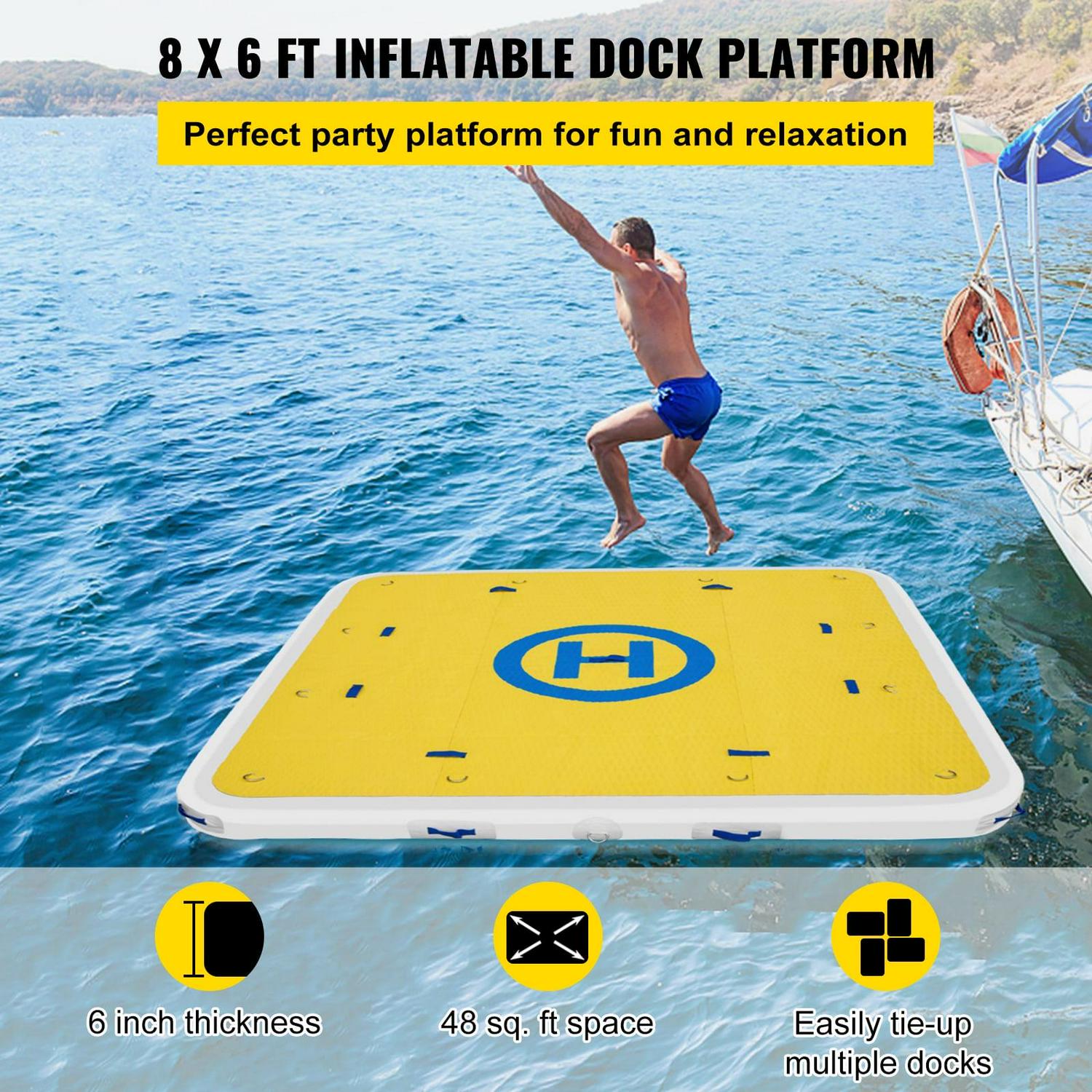 The inflated dock measures 8 ft x 6 ft x 6 inches (L x W x H), with 772 LBS maximum weight capacity, suitable for 3-4 adults. It is a must-have for summer water amusement.