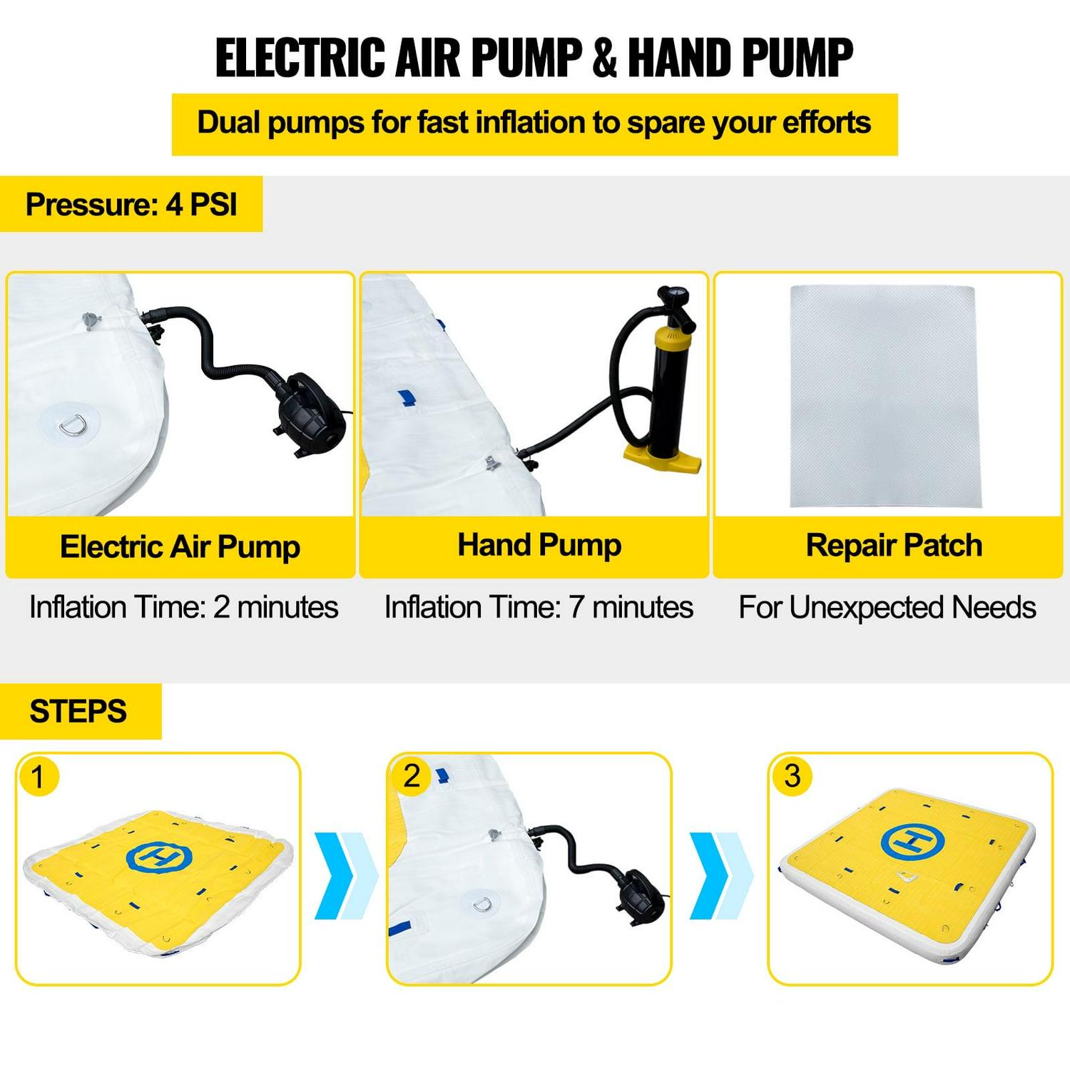 Fast Inflation & Deflation: The floating swim platform has an electric air pump and a hand pump for quick inflation and deflation. You can complete the inflation with the electric air pump in 2 minutes; with the hand pump, 7 minutes. By the way, a repair kit is included.