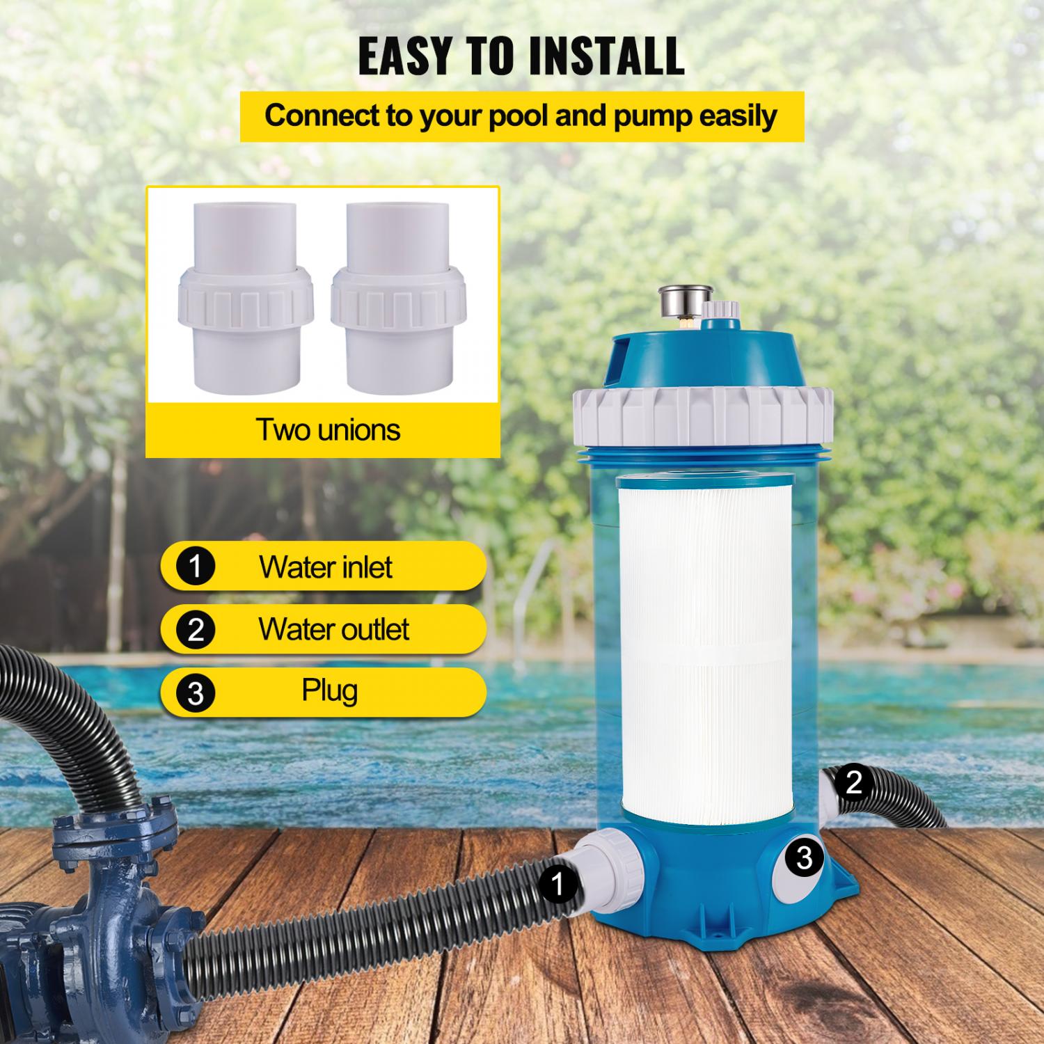 – Easy Installation: The swimming pool filter has two water inlets and a water outlet, including 2 unions for easy installation. One of the water inlets can be plugged with the plug, the other water inlet can be connected to the pump, and the water outlet to the swimming pool for water purification.