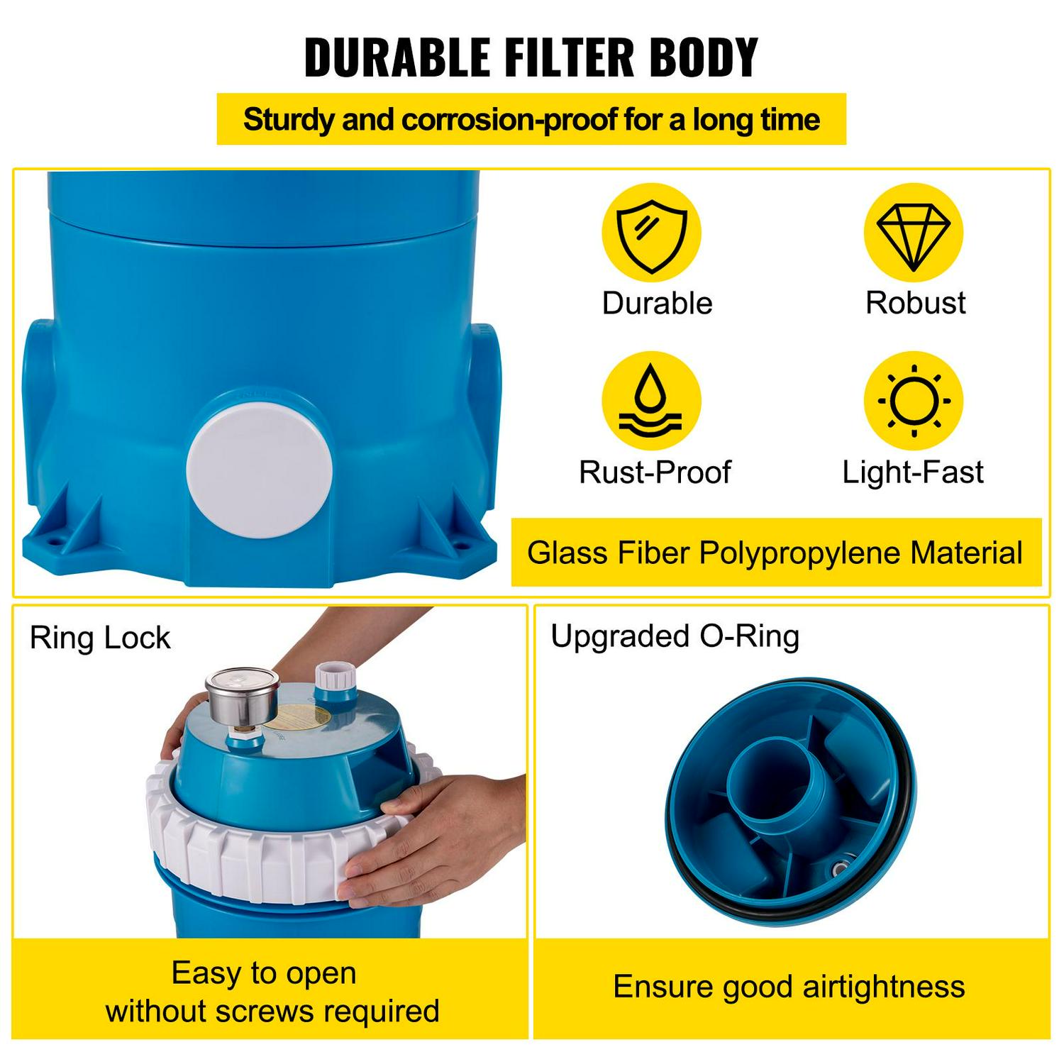 The filter enclosure is made of glass fiber polypropylene material, sturdy and corrosion-proof. The ring lock allows you to open the filter and clean the cartridge easily without screws troubles.