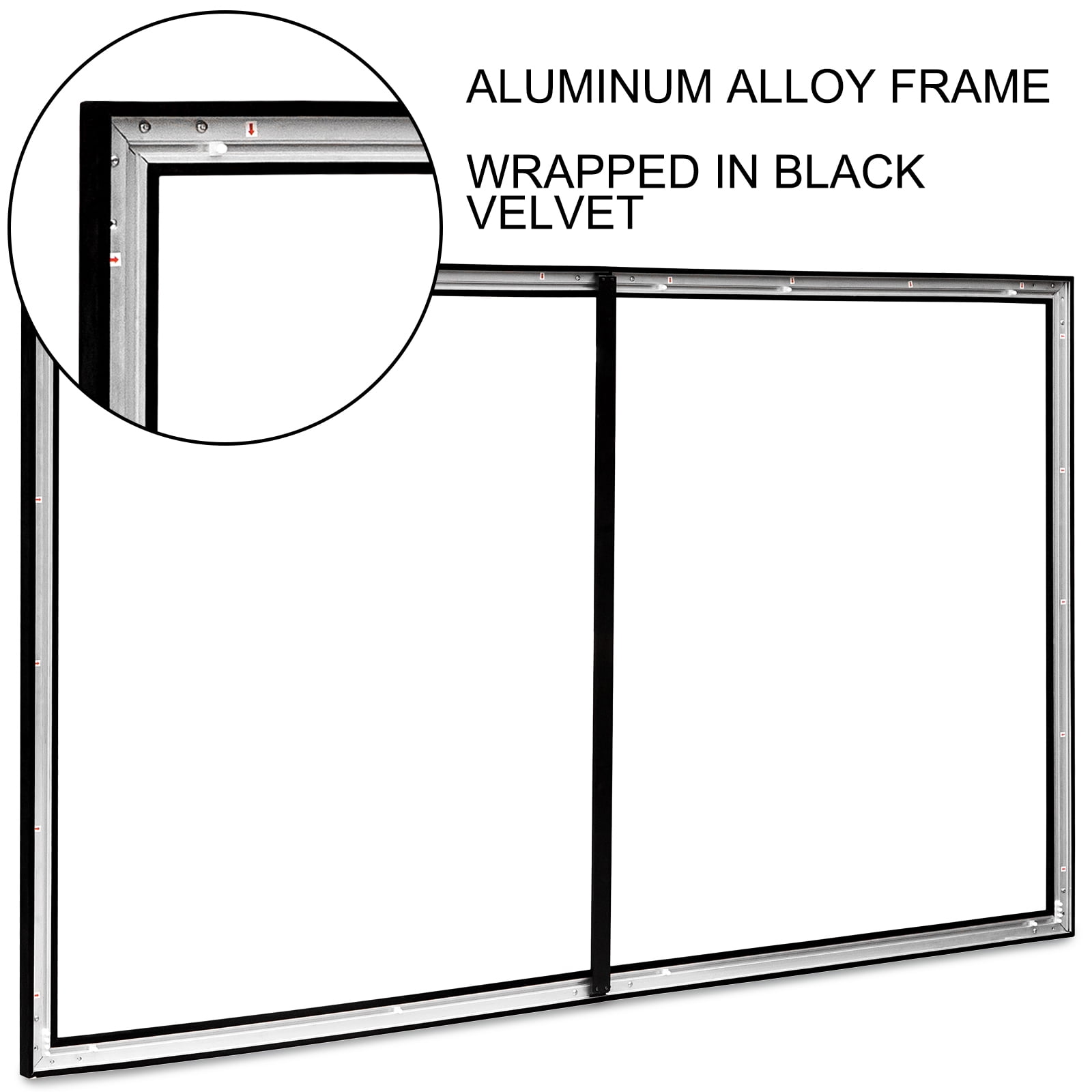 Brand Introduction VEVORbrand is a leading brand that specializes in equipment and tools. Along with thousands of motivated employees,VEVORbrand is dedicated to providing our customers with tough equipment & tools at incredibly low prices. Today, VEVORbrand has occupied markets of more than 200 countries with 10 million plus global members. Why Choose VEVORbrand? 1.Tough Quality Assurance 2.Incredibly Low Prices 3.Fast & Secure Delivery 4.30-Day Free Returns 5.24/7 Professional Customer Service Product Description 100″ 16:9 Projector Screen The premium 100-inch projector screen adopts NM optical PVC screen, provides you with more explicit images. Better than fabric ones, our video screen is wrinkle-, with no texture, and water washable. It is compatible with daily 3D movies, 4K, HDTV, PPT, pictures, and games. With a 160-degree viewing angle, when paired with the HD projector, you can enjoy cinema-quality entertainment at home. Aluminum Alloy Frame The movie screen’s frame is made of high-strength aluminum alloy, wrapped in black velvet, making it light-absorbing and beautiful. High-Definition Screen With high-quality PVC material, the screen for projector features low reflectivity and presents brighter, softer, and clearer images for the audience. 160-Degree Viewing Angle The outdoor screen provides an extensive viewing angle of 160 degrees, allowing users to choose comfortable viewing positions freely. Wall-Mounted Design The wall-mounted design makes this movie projector screen easy to install. Two hanging parts on the top frame are used for wall-hanging. Easy to Clean This portable movie screen can be easily wiped clean with a cloth or washed with water. It is wrinkle- but cannot be machine washed. Wide Application Ideal for home, classroom, office, wedding, bar, party, etc., this portable screen for projector is widely used for film and video screening. Specifications Screen Resolution: 4K HD Compatible Aspect Ratio: 16:9 View Angle: 160° (Actual) Gain: 1.2 Diagonal Size: 100″/254 cm Screen Material: PVC Frame Material: Aluminum Alloy Frame Surface Material: Black Velvet Screen Size: 87.1″ x 49″/221 x 124 cm Frame Size: 91.8″ x 53.7″/233 x 136 cm Item Weight:12.4kg/27.34lbs Package Content 1 x Projector Screen (with Accessories) 1 x Install Instruction