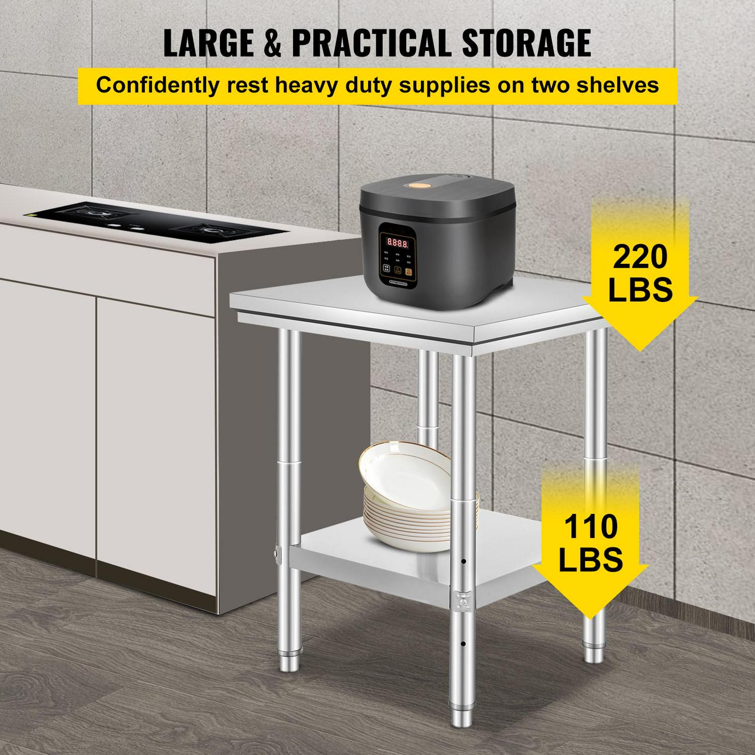 This kitchen prep table is of superior strength by providing a loading capacity of 500 lbs on top shelf and 220 lbs on undershelf without shaking.