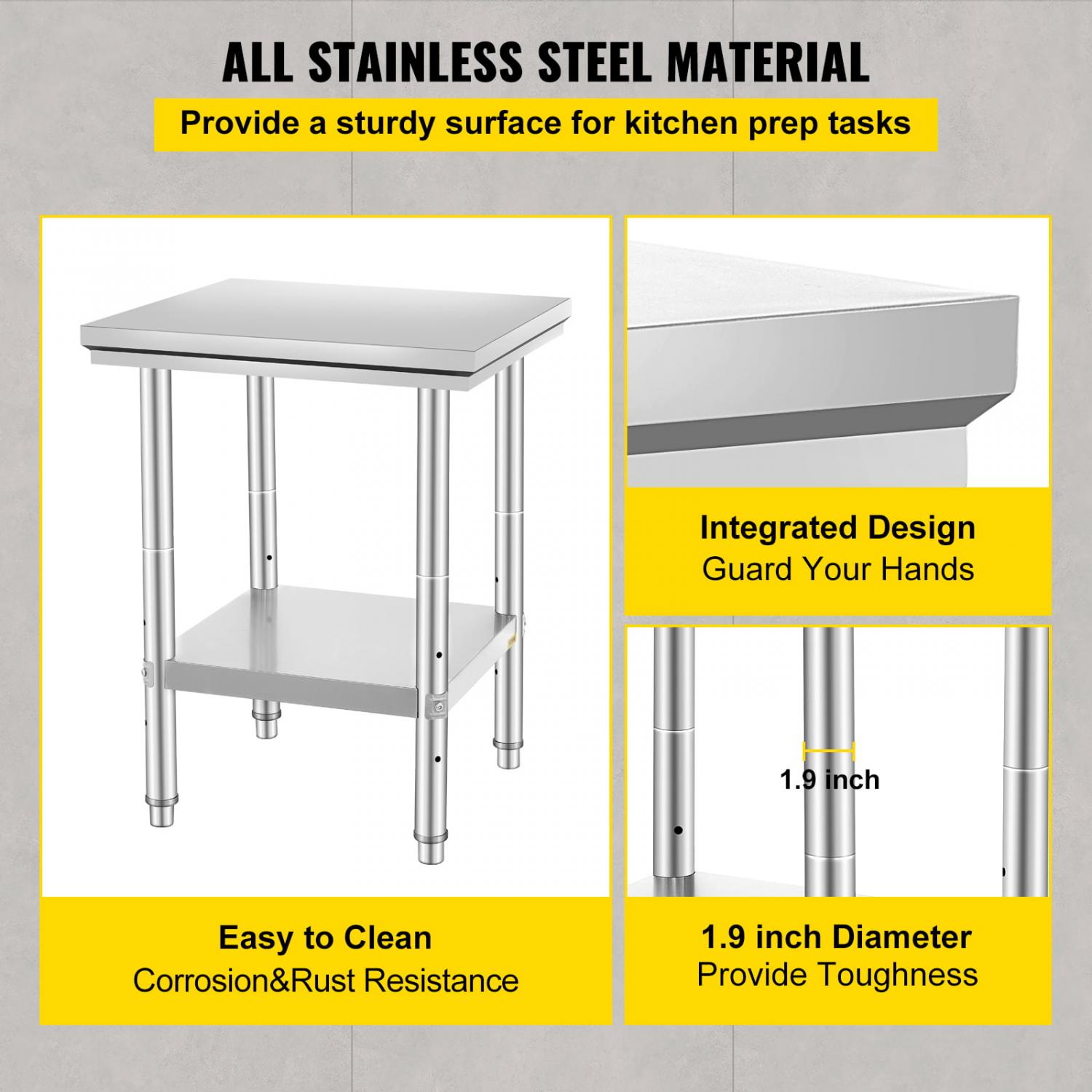 Superior commercial work table. Constructed by durable non-magnetic stainless steel, corrosion and wear resistant, won t deform easily with no fuss, mess or contamination. 23.6″x23.6″ upper table size with 4 adjustable feet. You can easily change the height by rotating the feet perfect using in the kitchen, restaurant, school, and any other domestic or commercial application.