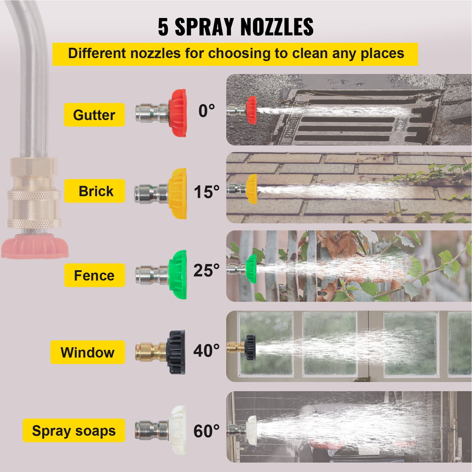 Brand Introduction VEVORbrand is a leading brand that specializes in equipment and tools. Along with thousands of motivated employees, VEVORbrand is dedicated to providing our customers with tough equipment & tools at incredibly low prices. Today, VEVORbrand has occupied markets of more than 200 countries with 10 million plus global members. Why Choose VEVORbrand? 1.Tough Quality Assurance 2.Incredibly Low Prices 3.Fast & Secure Delivery 4.30-Day Free Returns 5.24/7 Professional Customer Service Product Description5-18ft Extension Wand Here, we provide you with a high-quality silver telescoping wand to meet your outdoor cleaning needs. With its lightweight material and the support harness design, you can achieve a complete cleaning without tiredness. If you want to look for an advanced washing tool, do not be hesitated! Strong Cleaning Effect This pressure washer telescoping extension wand is suitable for cleaning the stubborn stains on the hard-to-reach corners, achieving a high-efficient cleaning effect. 5-18ft Telescoping Wand Easily fasten or loosen to adjust the length; you can find the most proper way to finish the cleaning job without tiredness. High areas can be cleaned quickly. Fit for 3/8″ Connector The inlet of the telescoping wand should be fitted with the 3/8″ quick connector (package included). You are suggested to use the tool with the pressure washer up to 4000PSI. 5 Different Spray Nozzles 5 different-color nozzles are suitable for different washing surfaces. You have no needs to prepare the nozzles, saving your time and costs. Randomly choose your needs. Effortless Operation For your convenient use, our pressure washer telescoping is designed with many humanized details: an adjustable labor-saving harness and a clamp for an excellent supporting position. Wide Use Scenarios The pressure washing tool is commonly used both for home and commercial occasions. Great to clean the driveway, sidewalk, pool deck, pool yard, porch, patio. Specifications Model: VV-TWW-18 Max. Pressure: 4000 PSI Max. Water Flow: 9 GPM Working Length: 5-18 ft/ 1.5-5.4 m Extension Rod Length: 3.1 ft/ 0.95 m Material: Aluminum Alloy + 430 Stainless Steel + Brass Fit for Inlet: 3/8″ Quick Connector Fit for Outlet: 1/4″ Quick Connecto Package Content 1 x Telescoping Wand 1 x 15°Extension Rod 1 x Strap Belt 5 x Spray Nozzles 1 x 3/8″ Quick Connector 1 x 1/4″ Quick Connector
