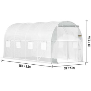 Size: 15 x 7 x 7 ft / 4.6 x 2.1 x 2.1 m. Our tunnel greenhouse has a large storage space with one door and 8 mesh windows to increase air flow for plants to thrive.