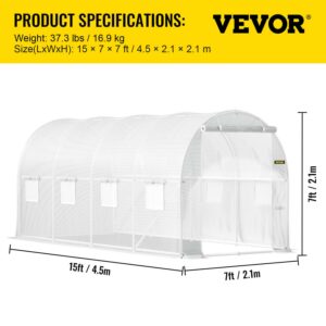 VEVORbrand Walk-in Tunnel Greenhouse, 15 x 7 x 7 ft Portable Plant Hot House w/ Galvanized Steel Hoops, 1 Top Beam, Diagonal Poles, Zippered Door and 8 Roll-up Windows, White