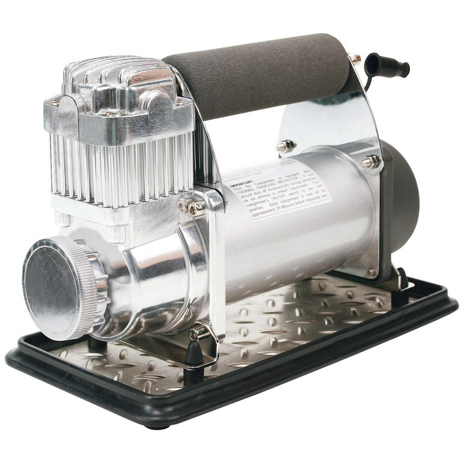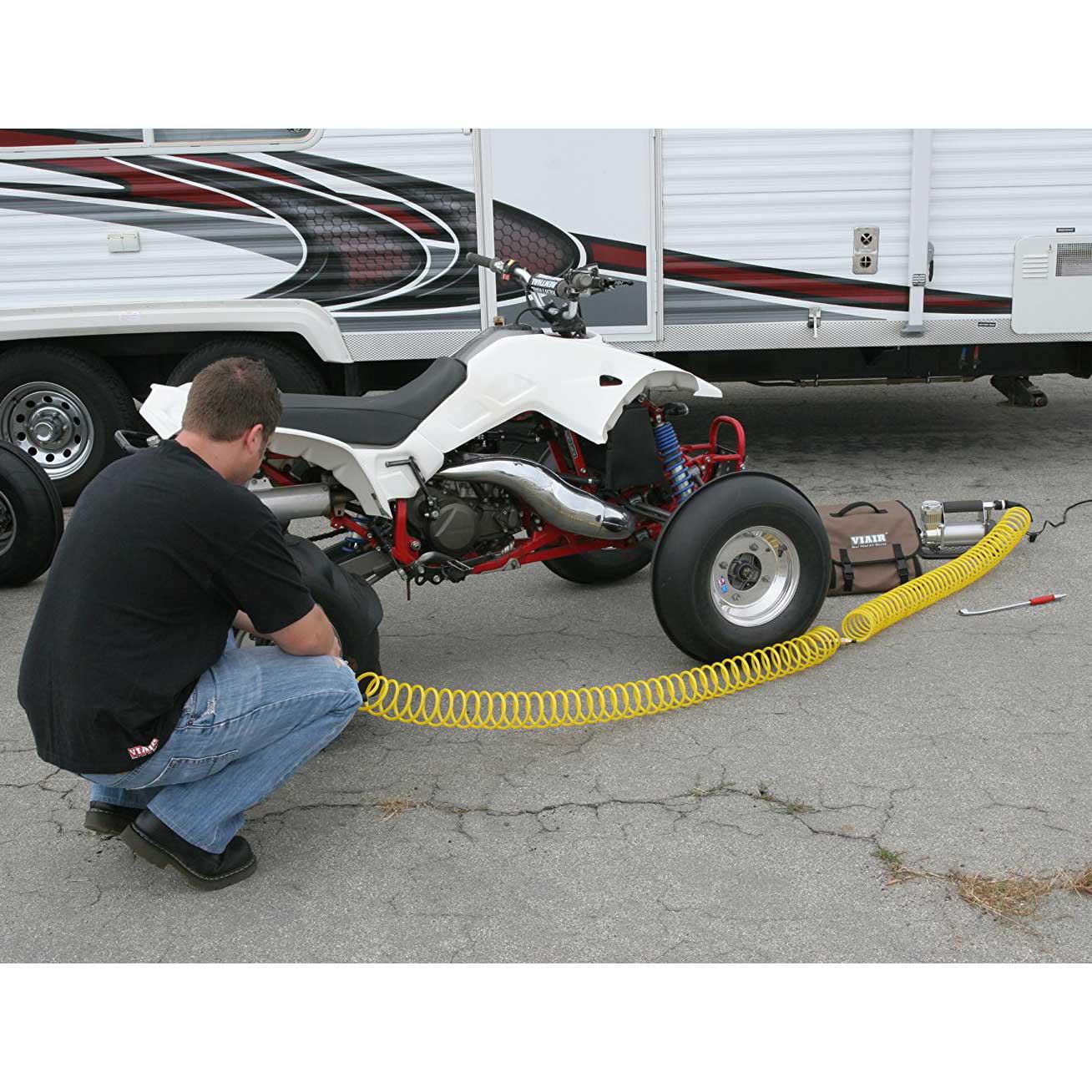 – Viair 400P Portable Compressor is a larger portable compressor kit that can inflate up to a 35 inch tire from 0 to 30 PSI in less than 5 minutes by simply attaching its supplied heavy duty battery clamp power leads to the battery, attaching the lever style air chuck to a tire valve stem and turning the unit on.