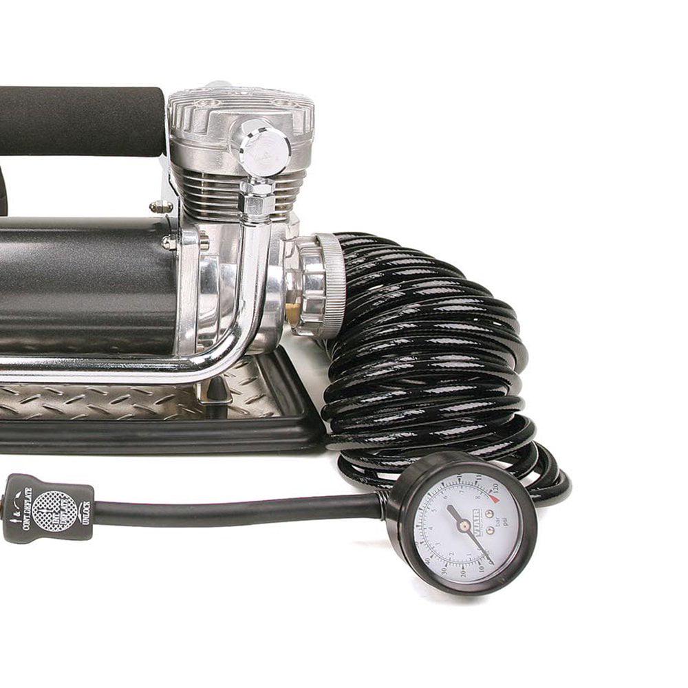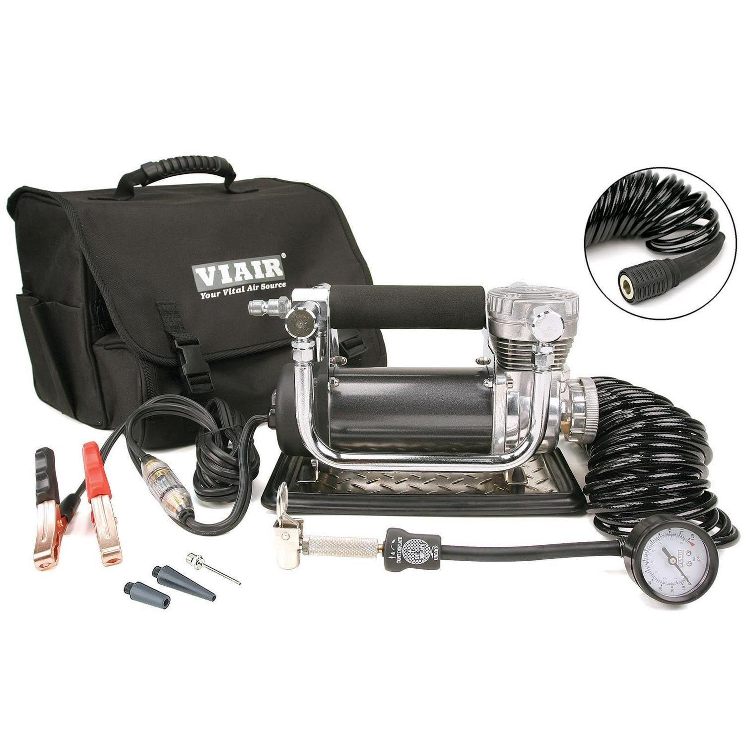 440P Portable Compressor Kit (12V, CE, 33% Duty, 150 PSI, 30 Min. @ 30 PSI)Viair 440P Portable Compressor is the largest, highest flowing portable compressor in the entire Viair portable compressor lineup. Simply attach its supplied heavy duty battery clamp power leads to the battery, and attach the lever style air chuck to a tire valve stem and turn the unit on, it can inflate up to 37 inch tires. Air pressure can be monitored using the 5-in-1 inline inflator/deflator hose and gauge included. Always turn off the unit to take an accurate pressure reading since air flow into the tire will show an inaccurate pressure reading while the unit is running.