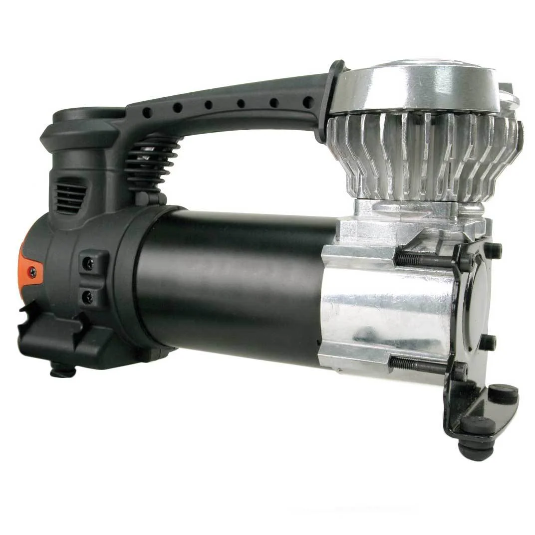 Monitor tire pressure with 120 PSI mounted gauge Comes with a kit with 3 inflation tips For tires up to 31 inches in size 60 PSI / 1.26 CFM Plugs into your cigarette lighter power port, connects to valve stem, and turns on Comes with deluxe carry bag, pressure gauge, brass twist-on tire chuck, accessory power plug, 3 inflation tips, and LED work light/ power indicator 20 minute, 30 PSI duty cycle Requires power port rated for 15 amps Built in LED work light and power indicator Accessory power plug Permanent magnetic motor Specifications: Air hose length: 3 feet Power cord length: 10 feet Voltage: 12 volts Maximum amp draw: 15 amps Max pressure: 60 PSI Minimum ambient temperature: -4 F Maximum ambient temperature: 158 F Ingress protection rating: IP53 Product/item type: Air compressor Material: Steel Color: Black Dimensions (L x W x H): 9.1 x 3.1 x 5.6 inches Weight: 4.3 pounds Manufacturer warranty: 1-year warranty