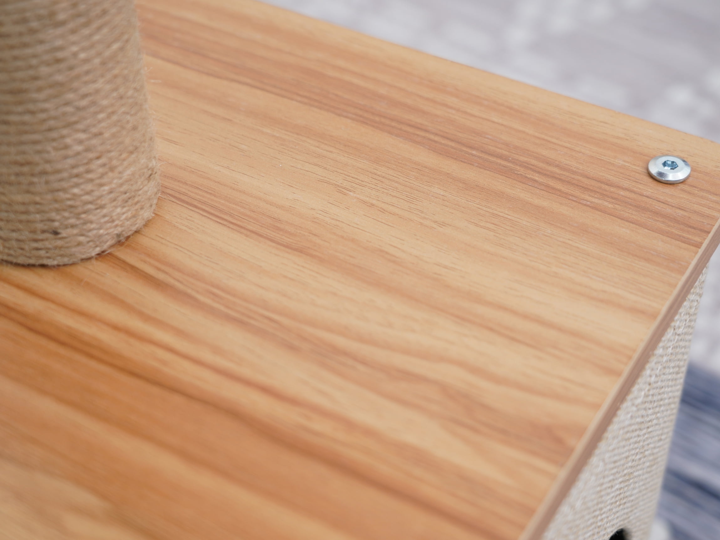 Vibrant Life New Minimalist Cat Furniture. Easy cleaning laminated wood board finish. 3 Level Cat tree with 3 teaser cat toys. Designed with a large bed perch. With a spacious base condo. All-natural jute scratching post.