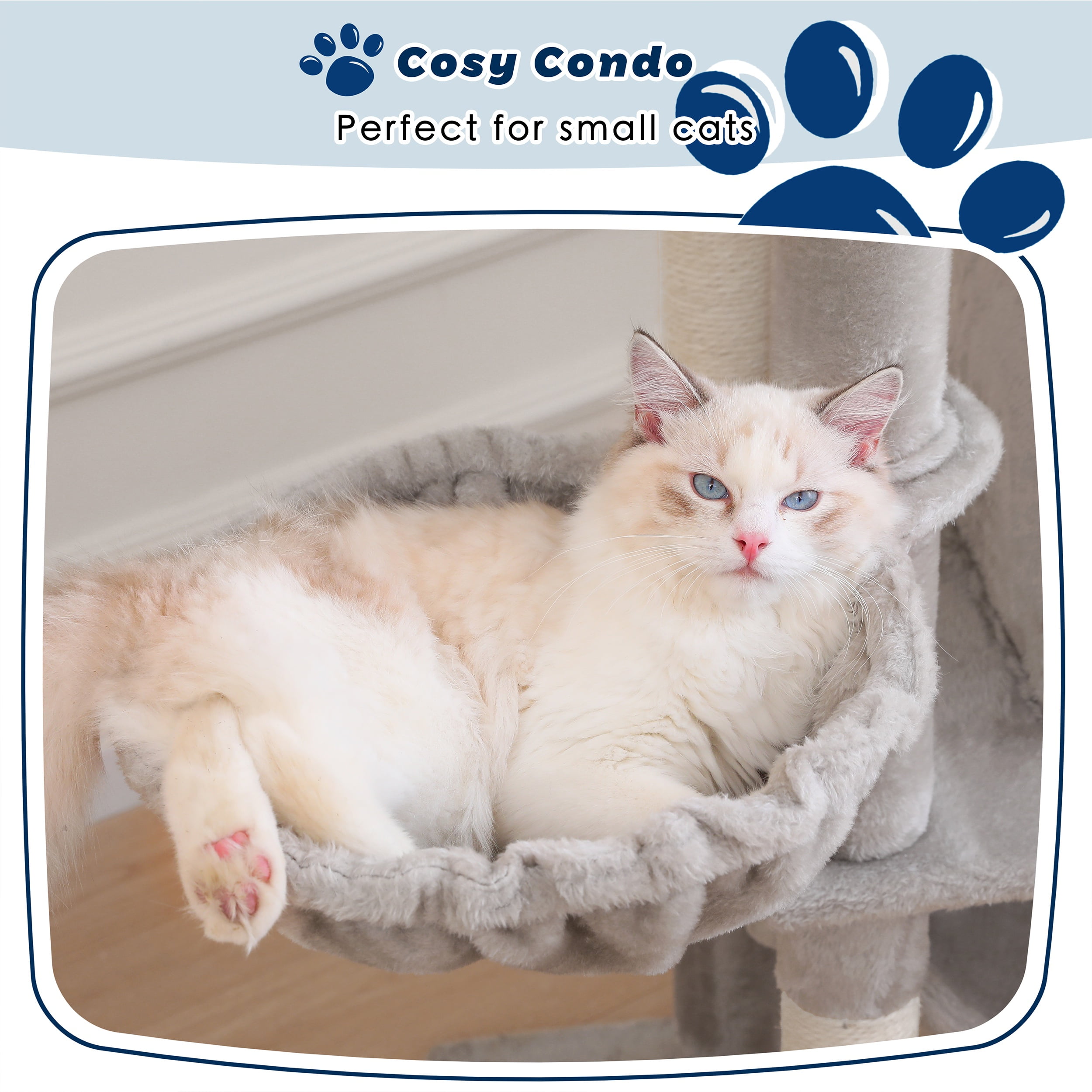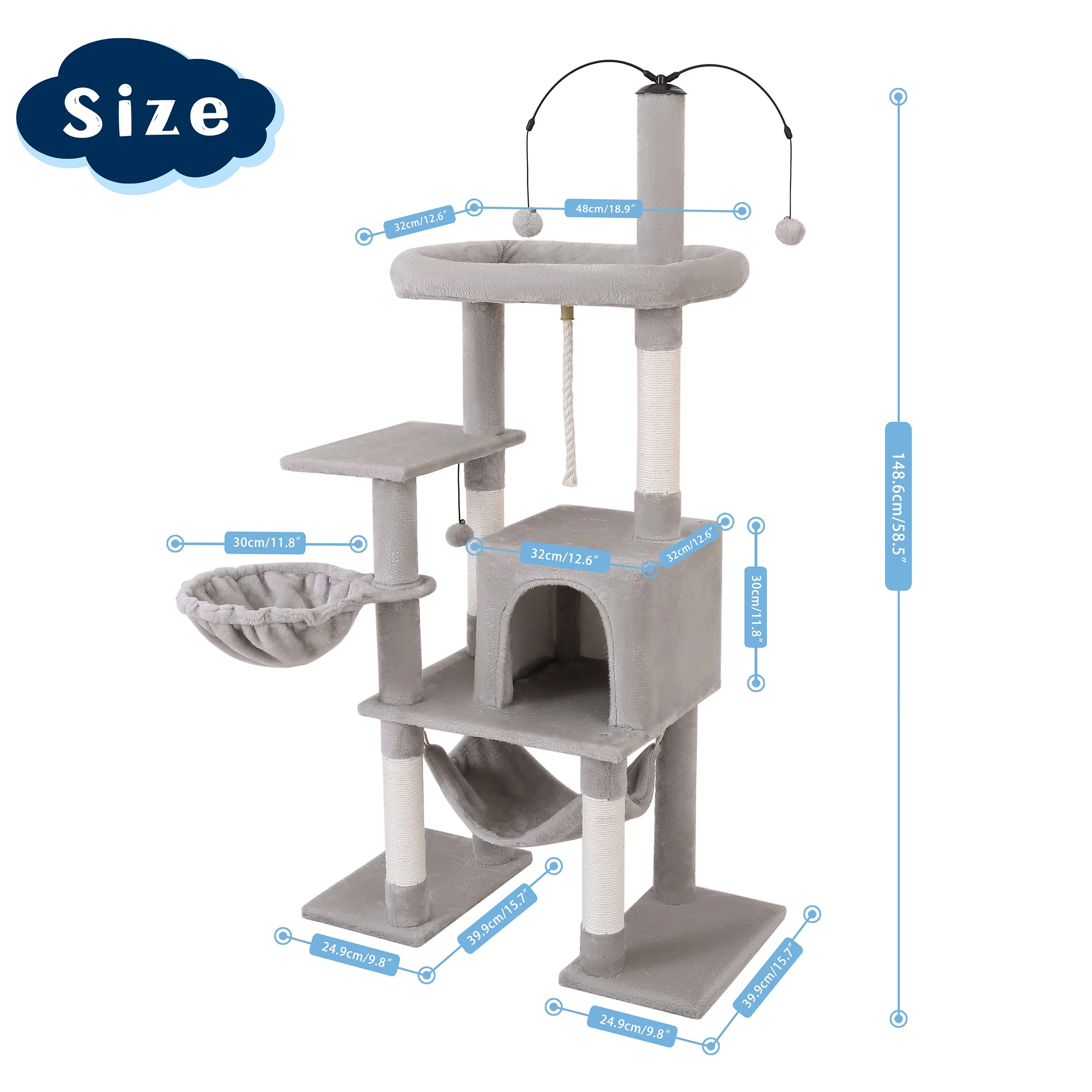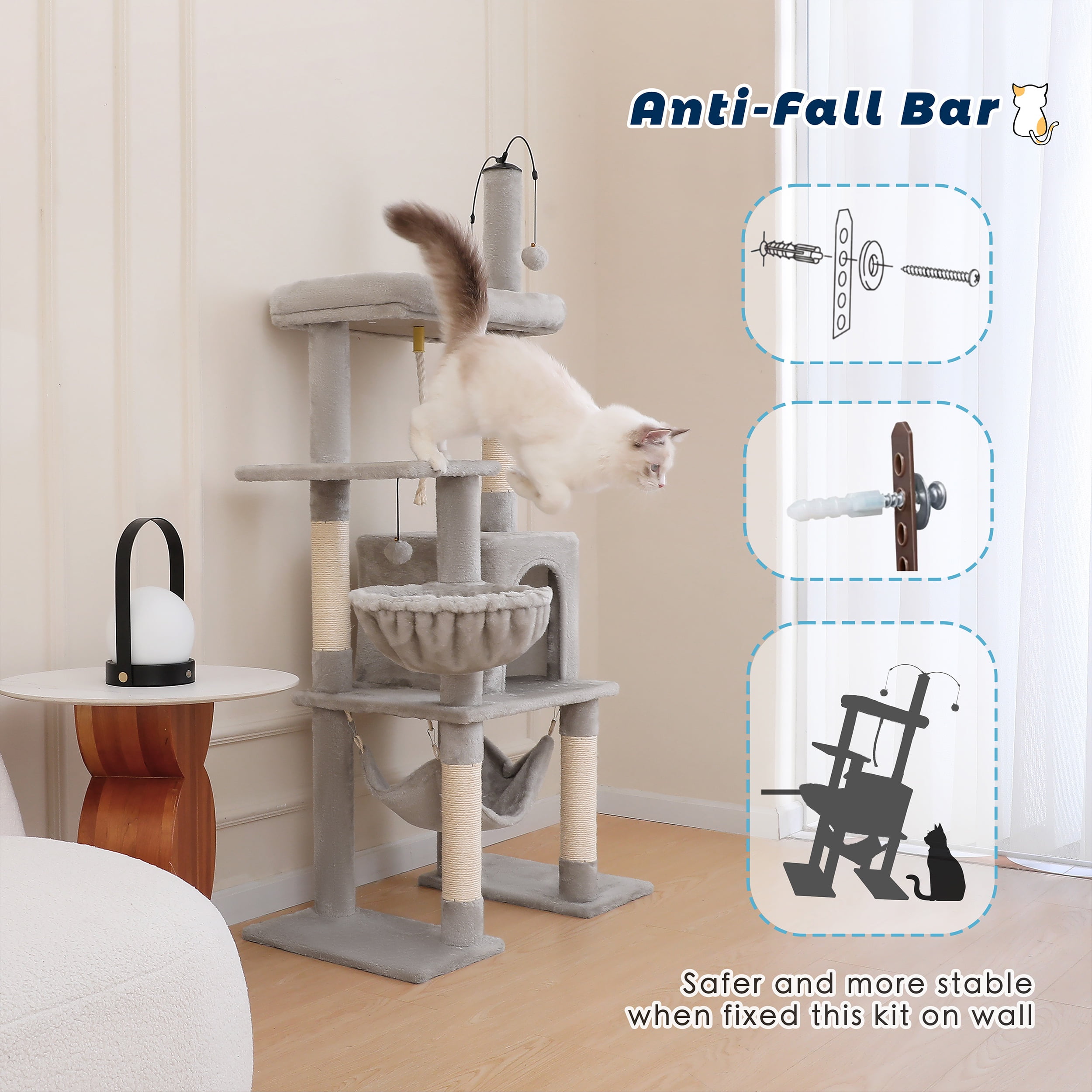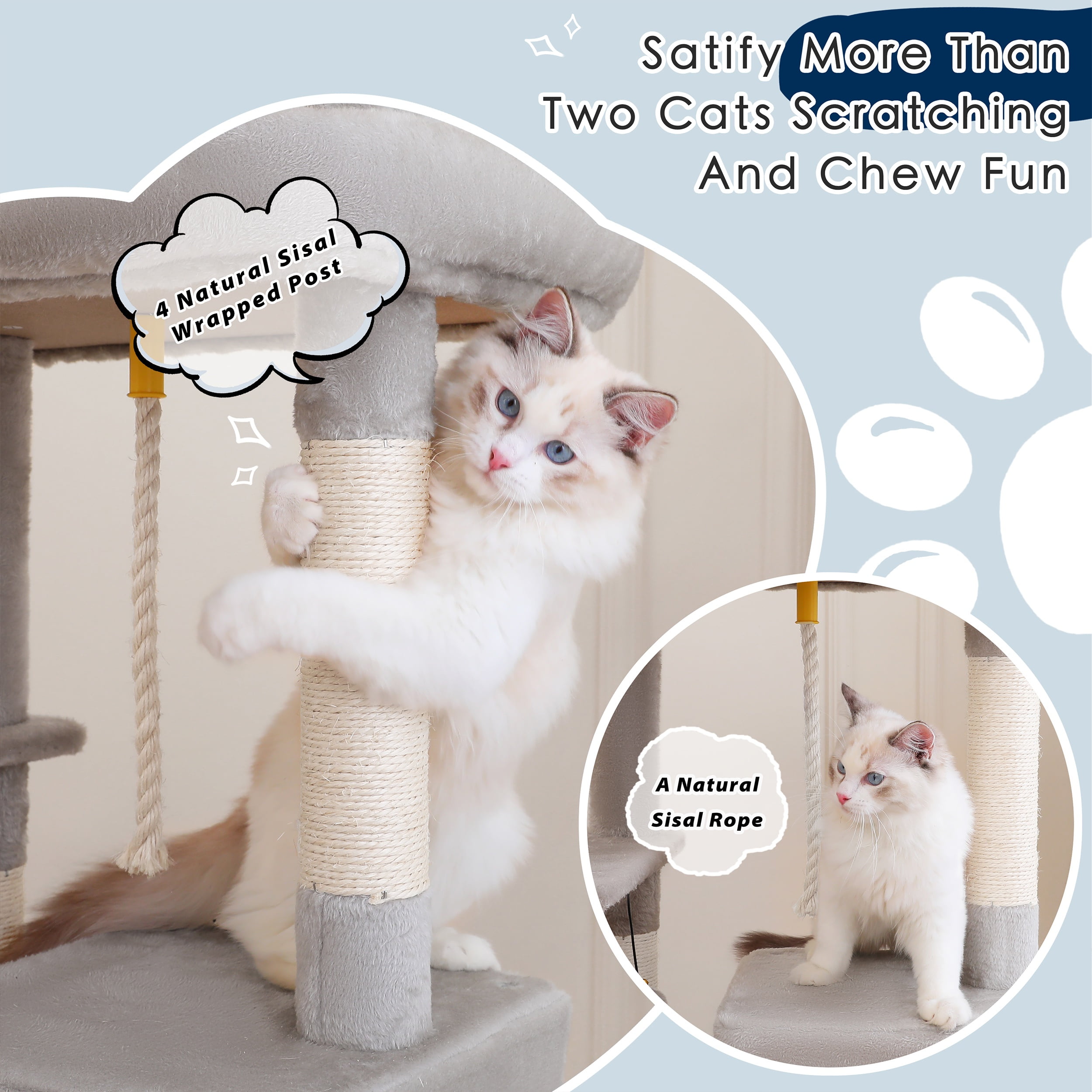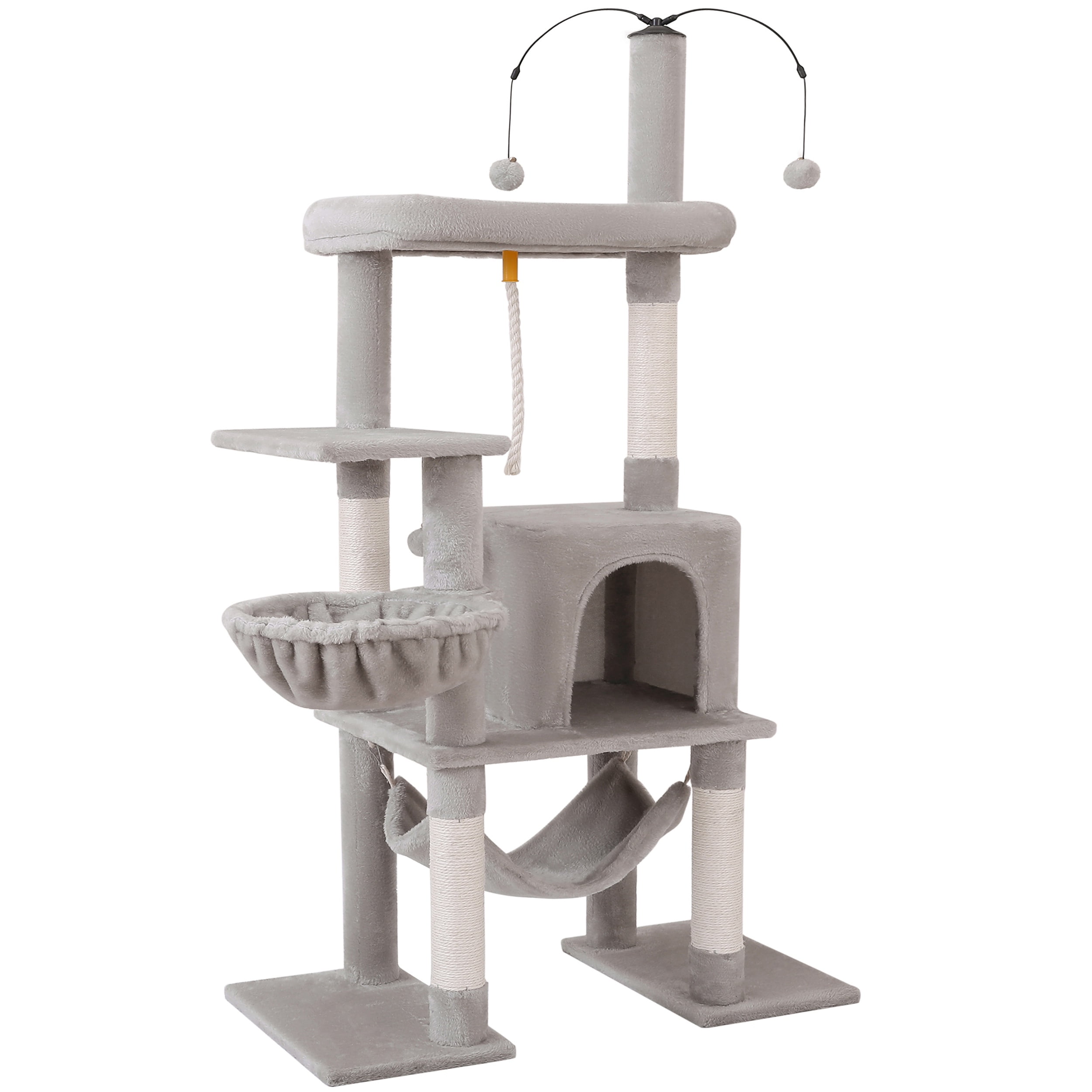 Made of grade P2 particle board and covered with skin-friendly plush, comfortable and warm for your adult cats or kitten to rest. Double robust bases and natural sisal posts rise a stable and secure environment for your cats to climb Wide and cushioned perch gives your cats the perfect lookout points to survey their kingdom. Equipped with sisal-wrapped scratching posts, this cat tree tower encourages healthy scratching habits and helps keep your furniture safe from claw damage. The dangling pom-poms add extra fun, stimulating your cat’s hunting instincts and providing hours of interactive play All necessary hardware and instructions are included for easy setup.