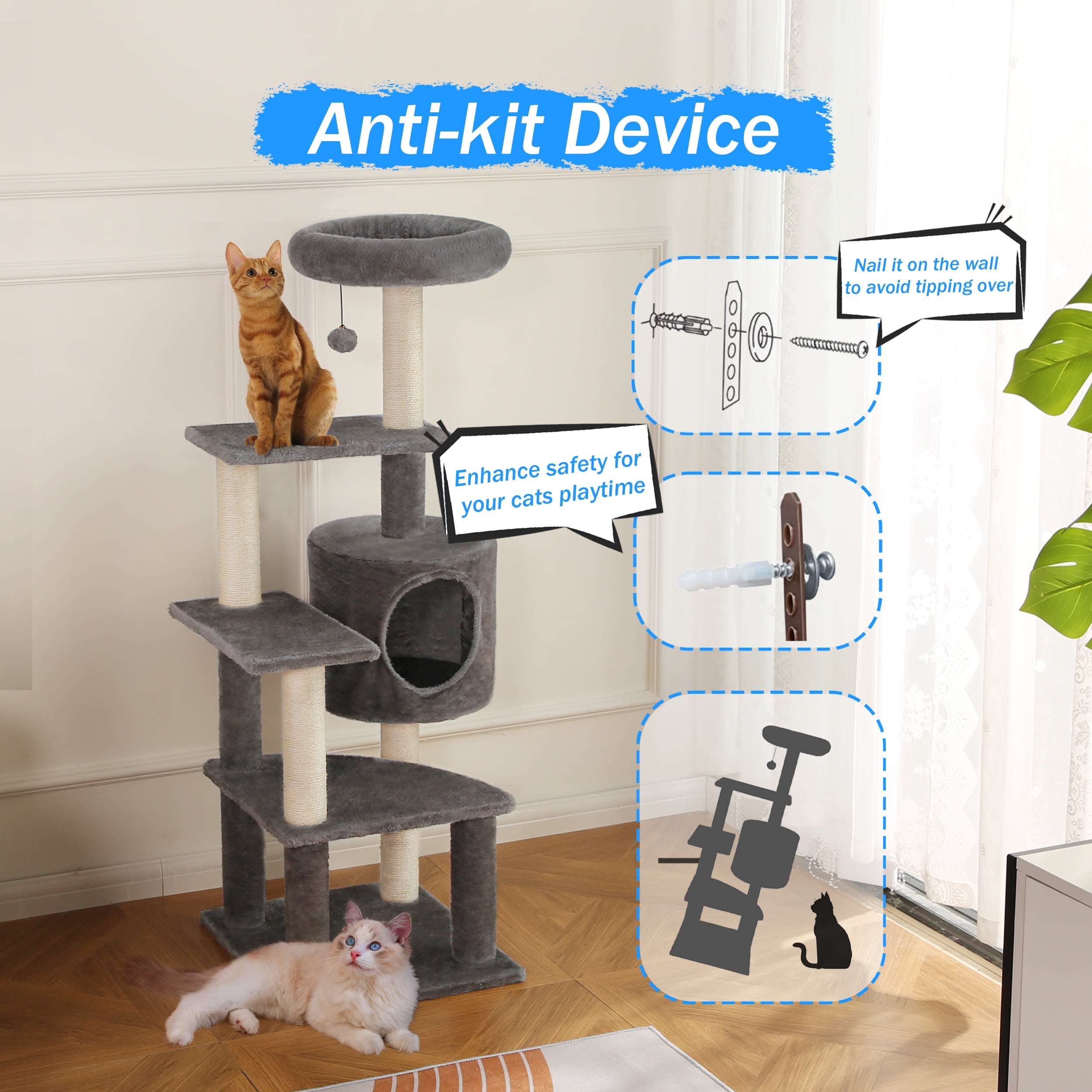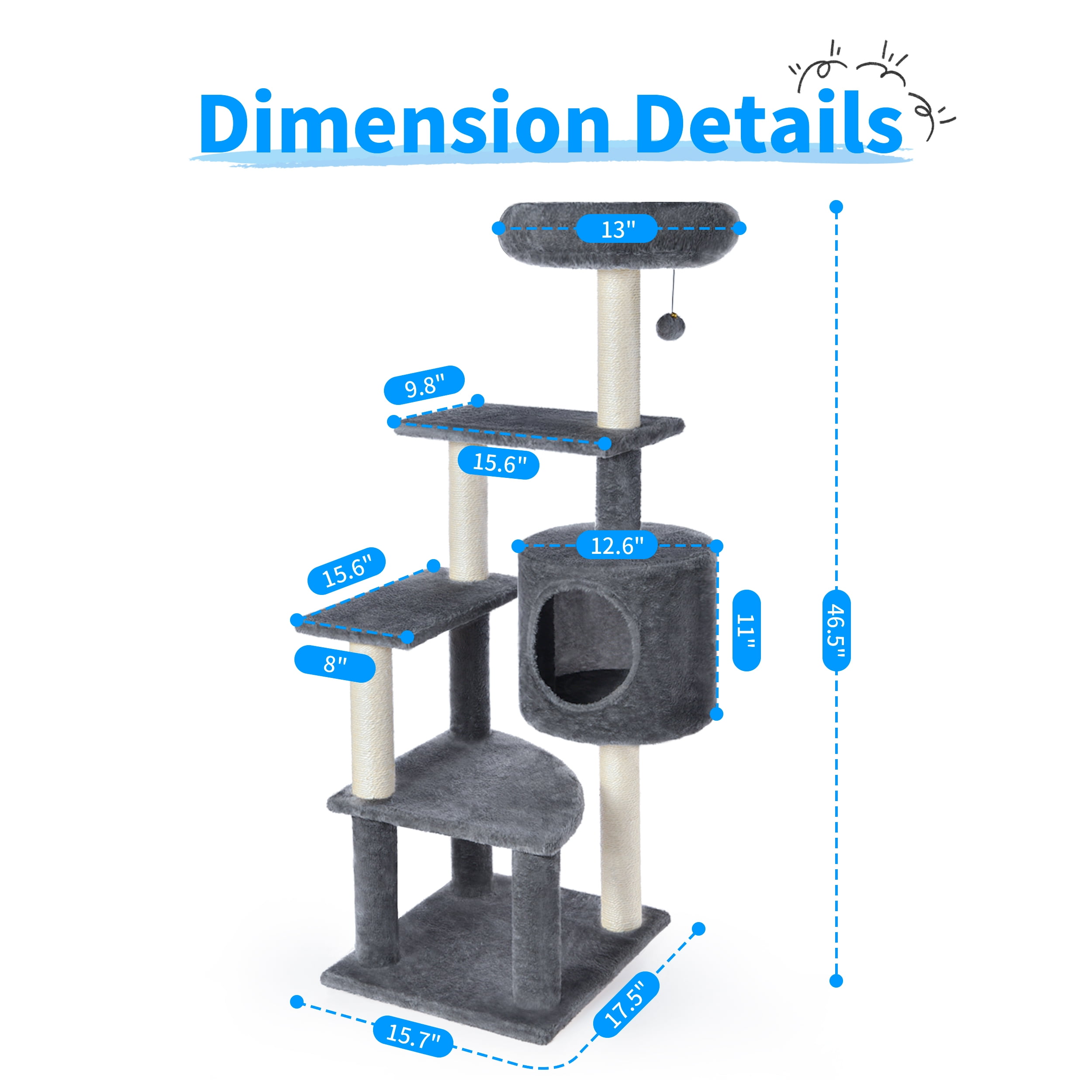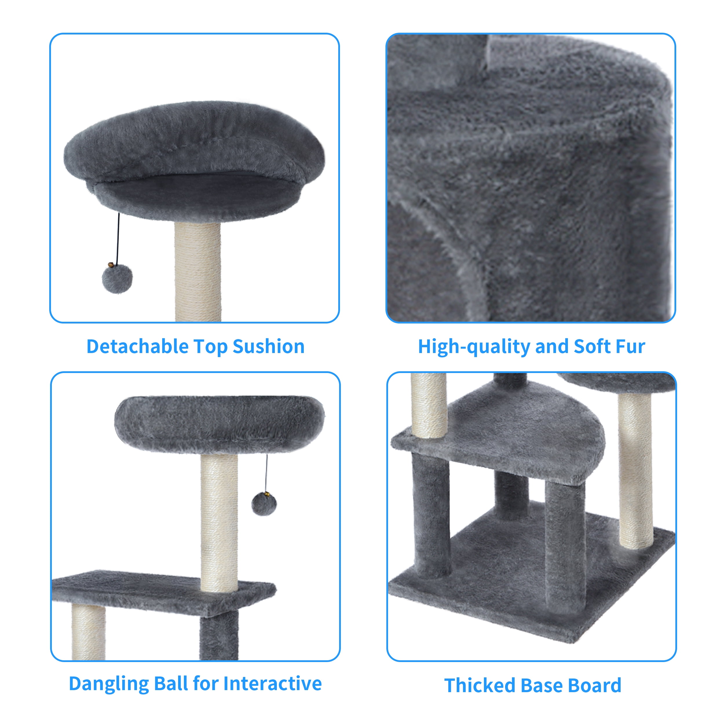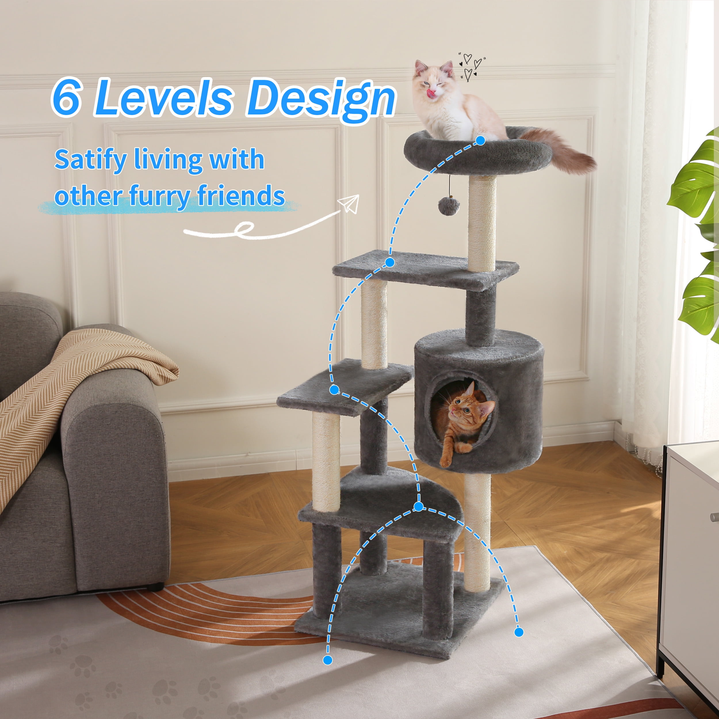 6 Levels for cats to play up and down 4 x Scratching posts for scratching fun 1 x Comfortable cat condo for playing hide-and-seek 1 x Large comfortable and soft perch for cat rest 1 x Hanging pompom for more fun