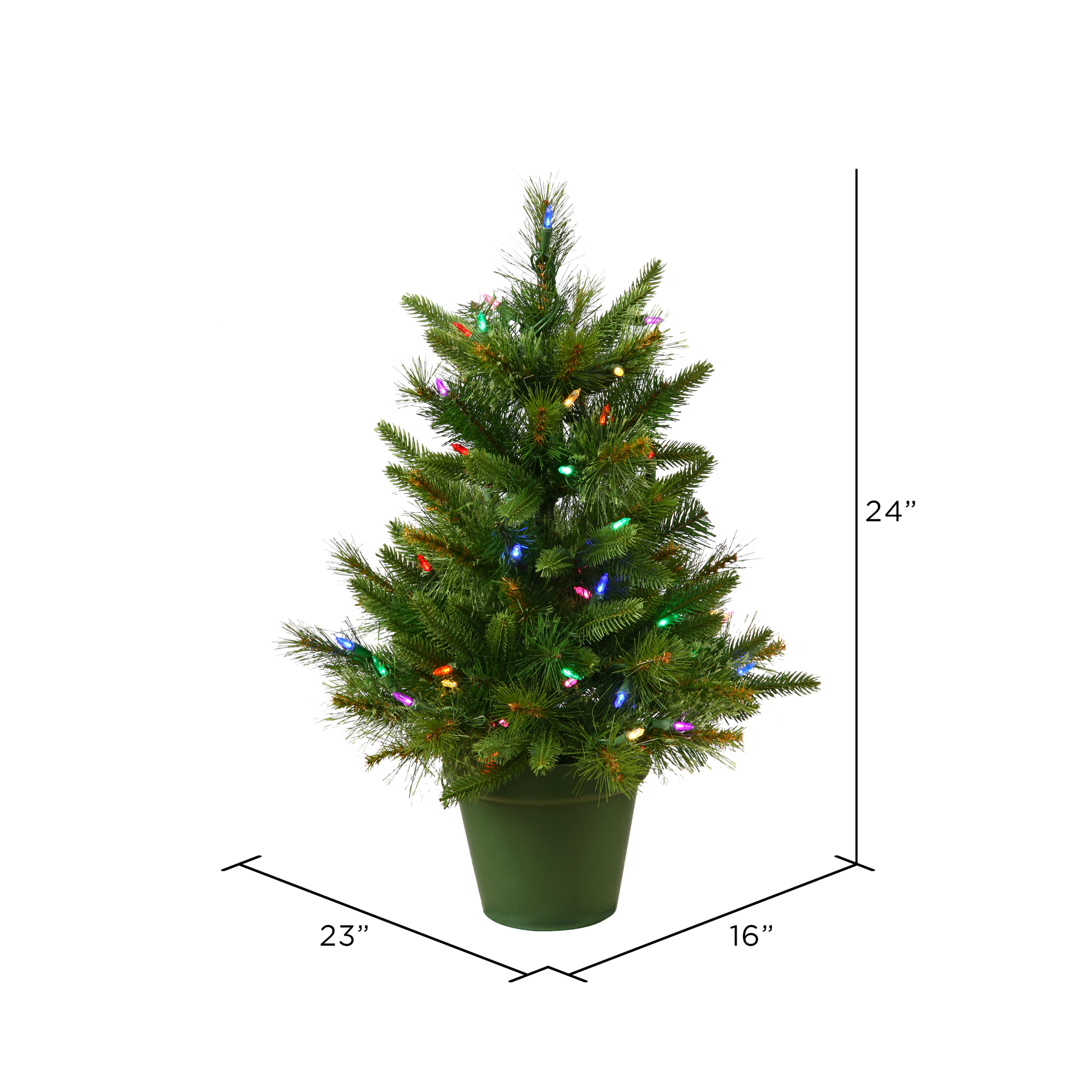 Vickerman 24″ x 16″ Cashmere Pine Artificial Christmas Tree featuring 79 PE/PVC/Hardneedle tips and 30 7-Color Italian Multi-color LED lights. This festive tree has a beautiful blend of PE, PVC, and Hardneedle tips, it comes prelit with LED lights and comes with a Battery Operated timer, a plastic tree stand is included.