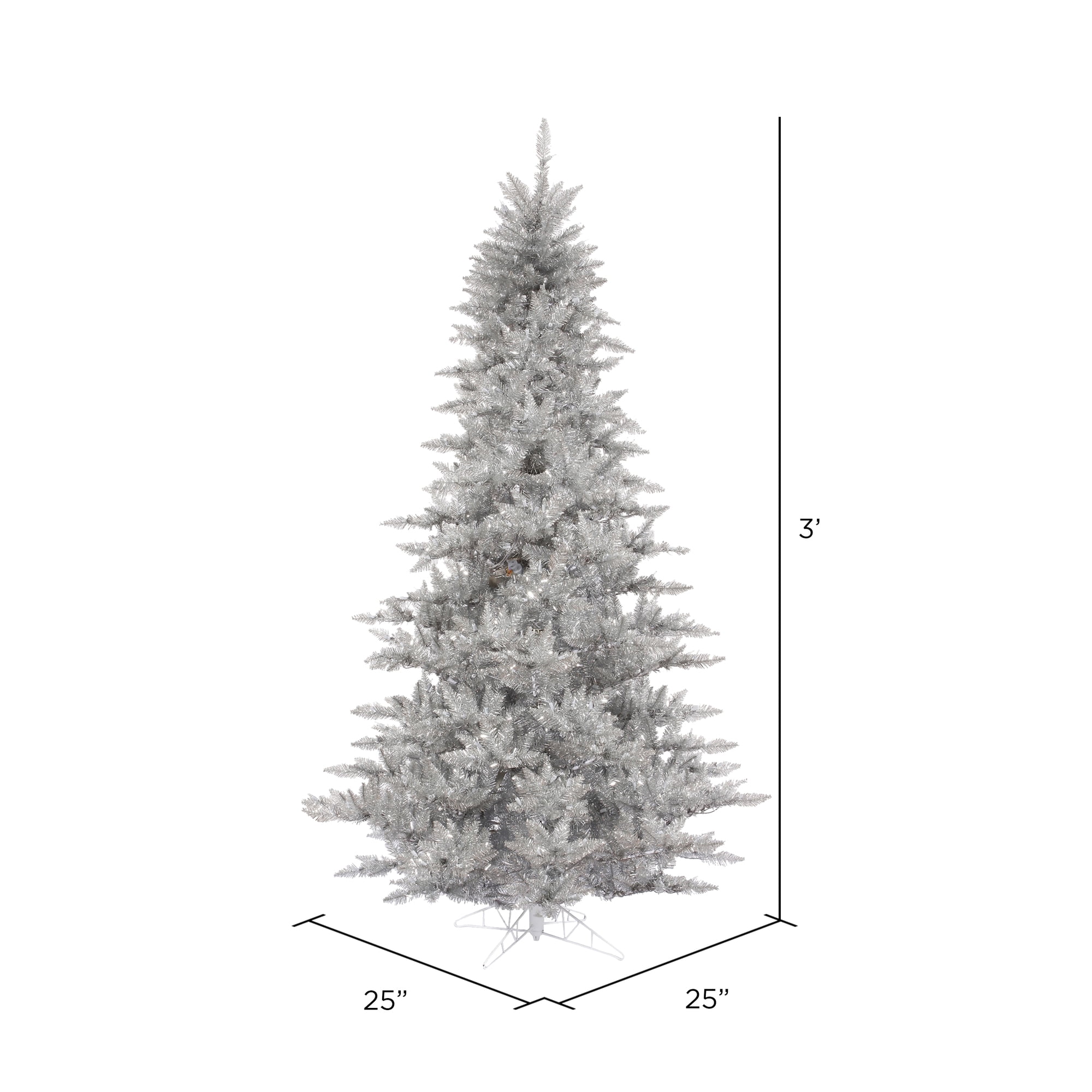 Vickerman 3′ x 25″ Silver Fir Artificial Christmas Tree featuring 234 PVC tips. An elegant alternative to the traditional green Christmas tree, this brilliant tree comes unlit, has rich colored PVC tips on pull down branches, and a plastic tree stand is included.