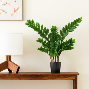 – Zamifolia Potted Faux Bush with 166 Leaves: This lifelike synthetic zamifolia bush plant in is a versatile piece of decor that can be placed in any decorative container to match your space.