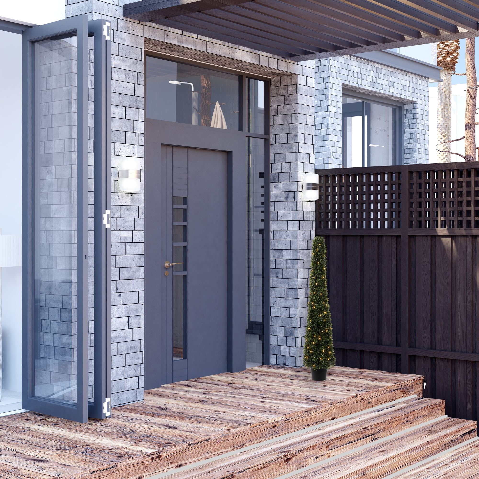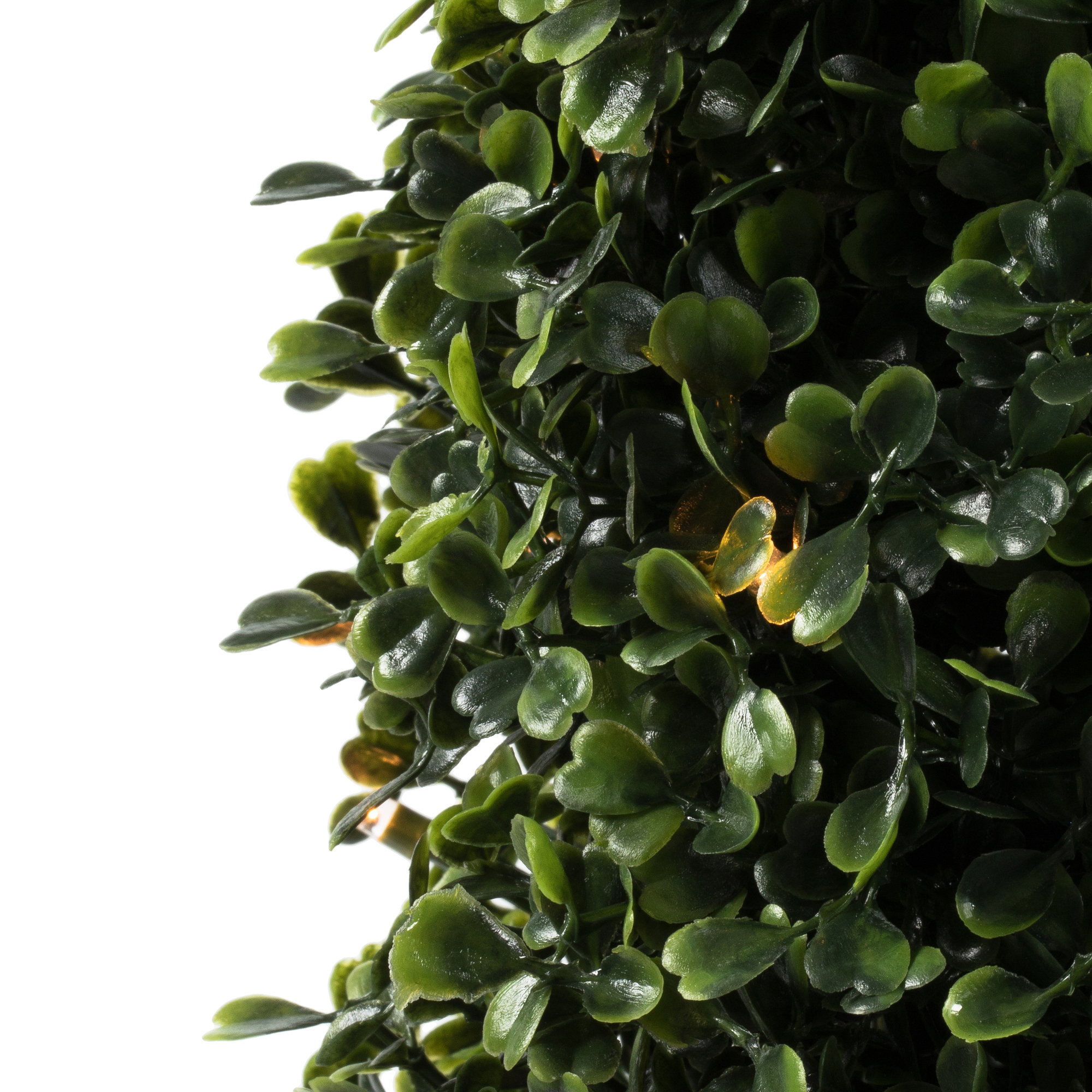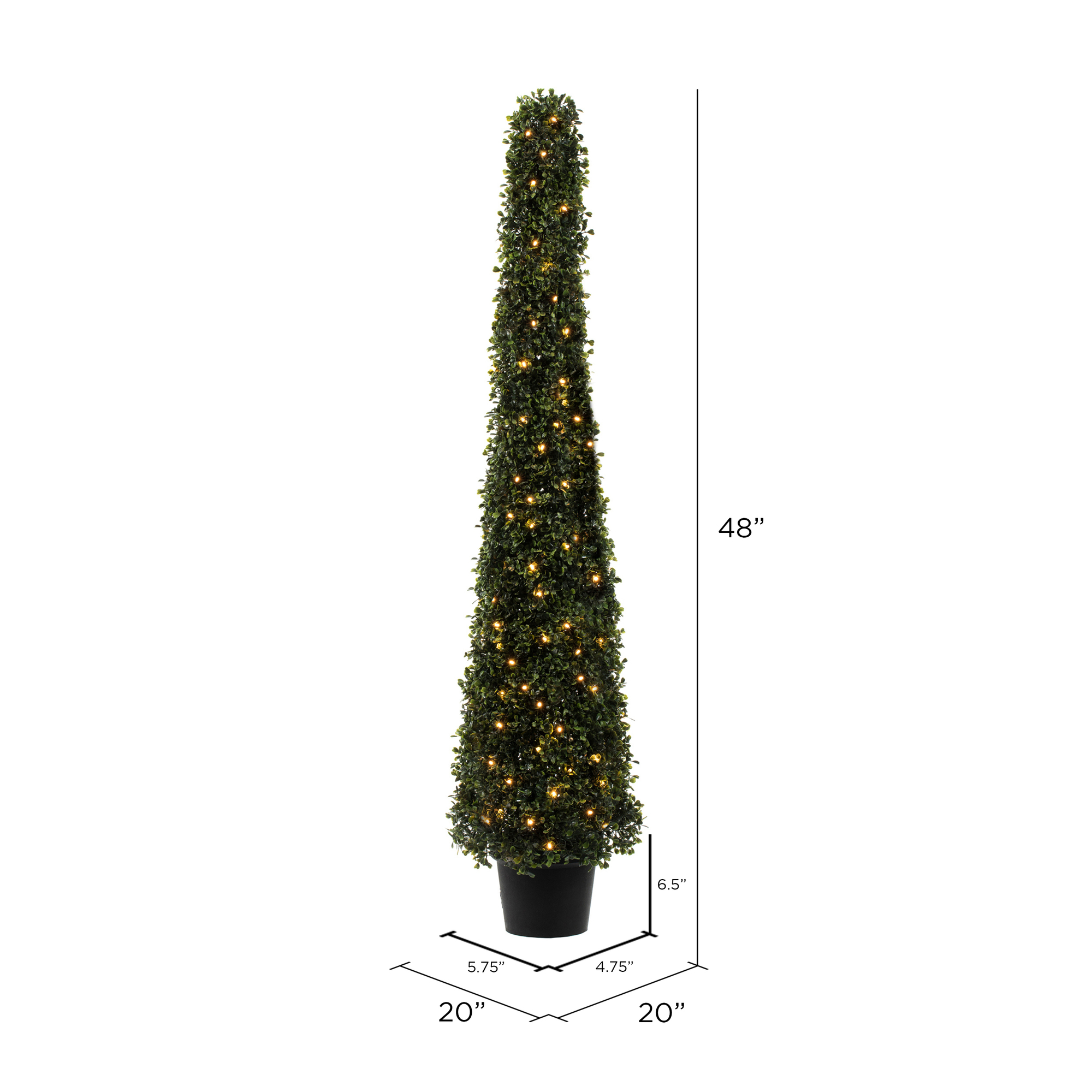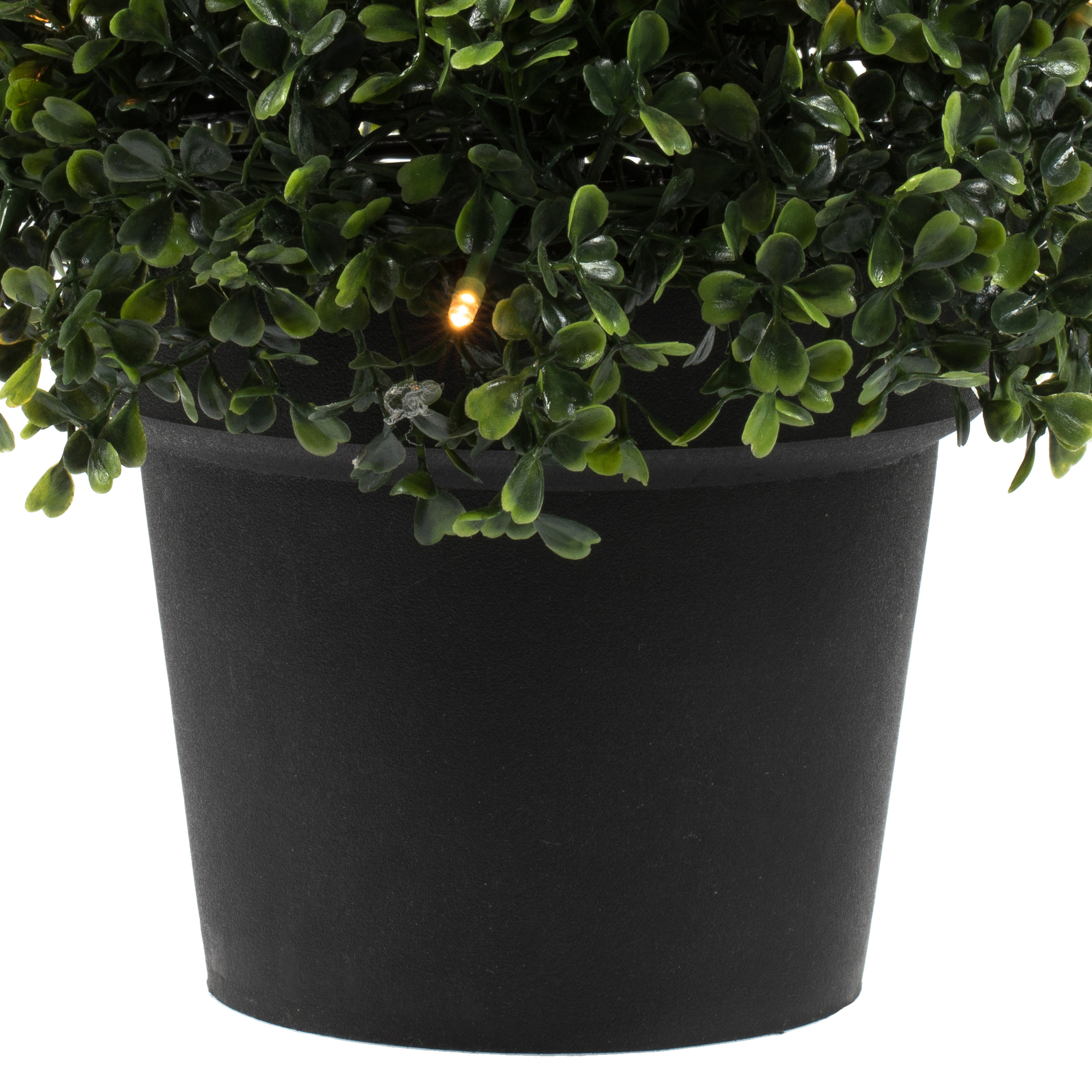 ADD A BEAUTIFUL ACCENT TO ANY ROOM DECOR. Front door topiary trees add a welcome feeling to any home. AVAILABLE IN A BLACK PLASTIC INSERTABLE POT, making this plant easy to place in the decorative container of your choice. LIGHTED WARM WHITE LED WRAPPED – 100 3mm warm white LED bulbs EASY TO CARE FOR – MAINTENANCE FREE. An occasional light dusting is all that is needed. 100 Warm White LED Lights Utilizes Energy-Efficient, Durable LED Technology