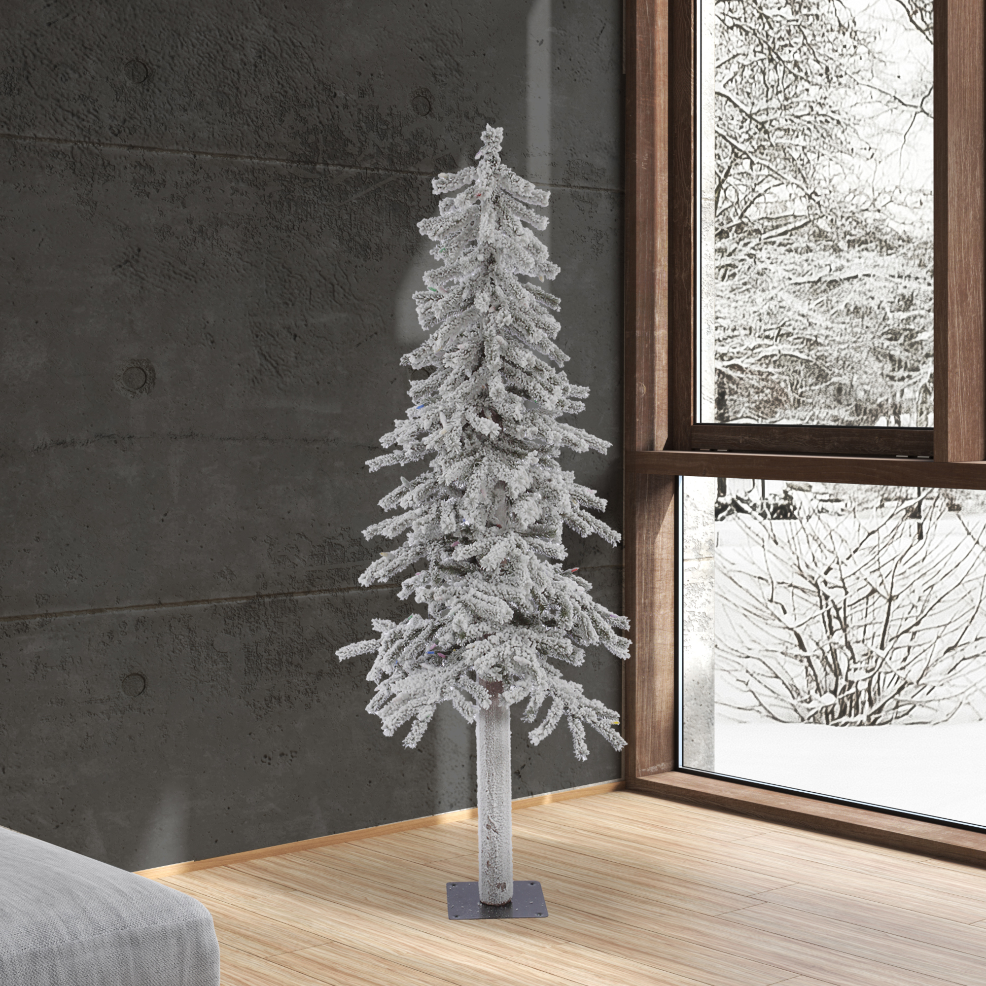 Vickerman Artificial 5′ x 28″ Flocked Alpine Christmas Tree with 348 PVC Tips. This tree comes unlit and has medium weight white flocking on green tips, a real wood trunk and a flat metal base is included.