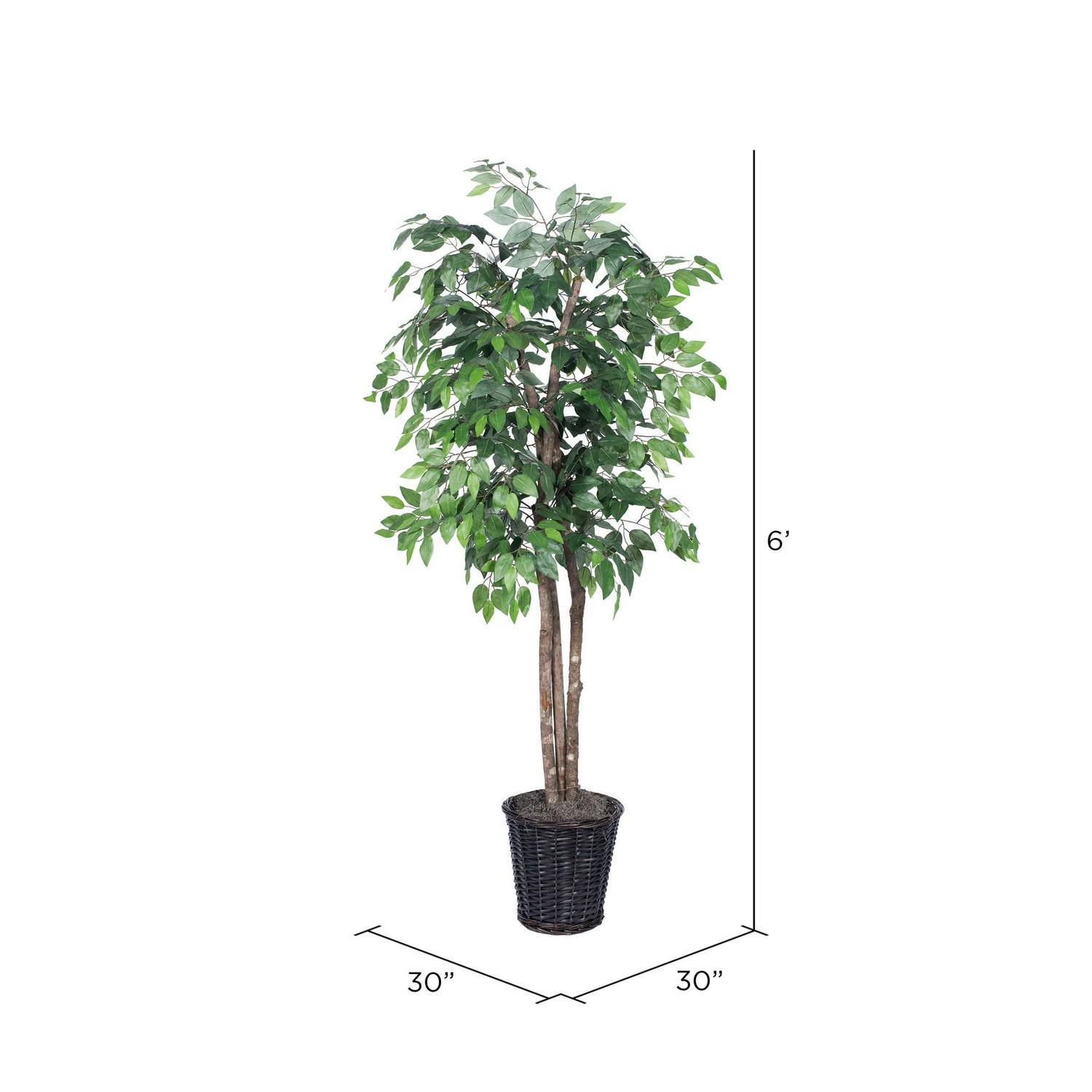 6′ Ficus Deluxe Tree natural hardwood trunks. Potted in dark brown rattan basket with excelsior.- SKU: VCK5637