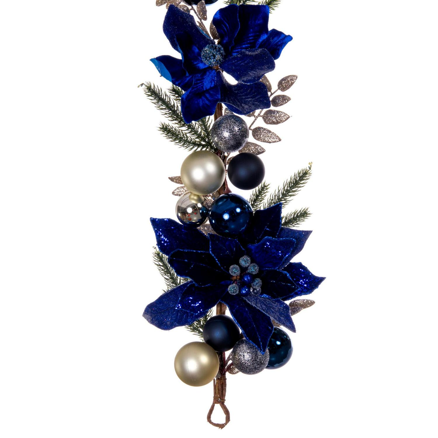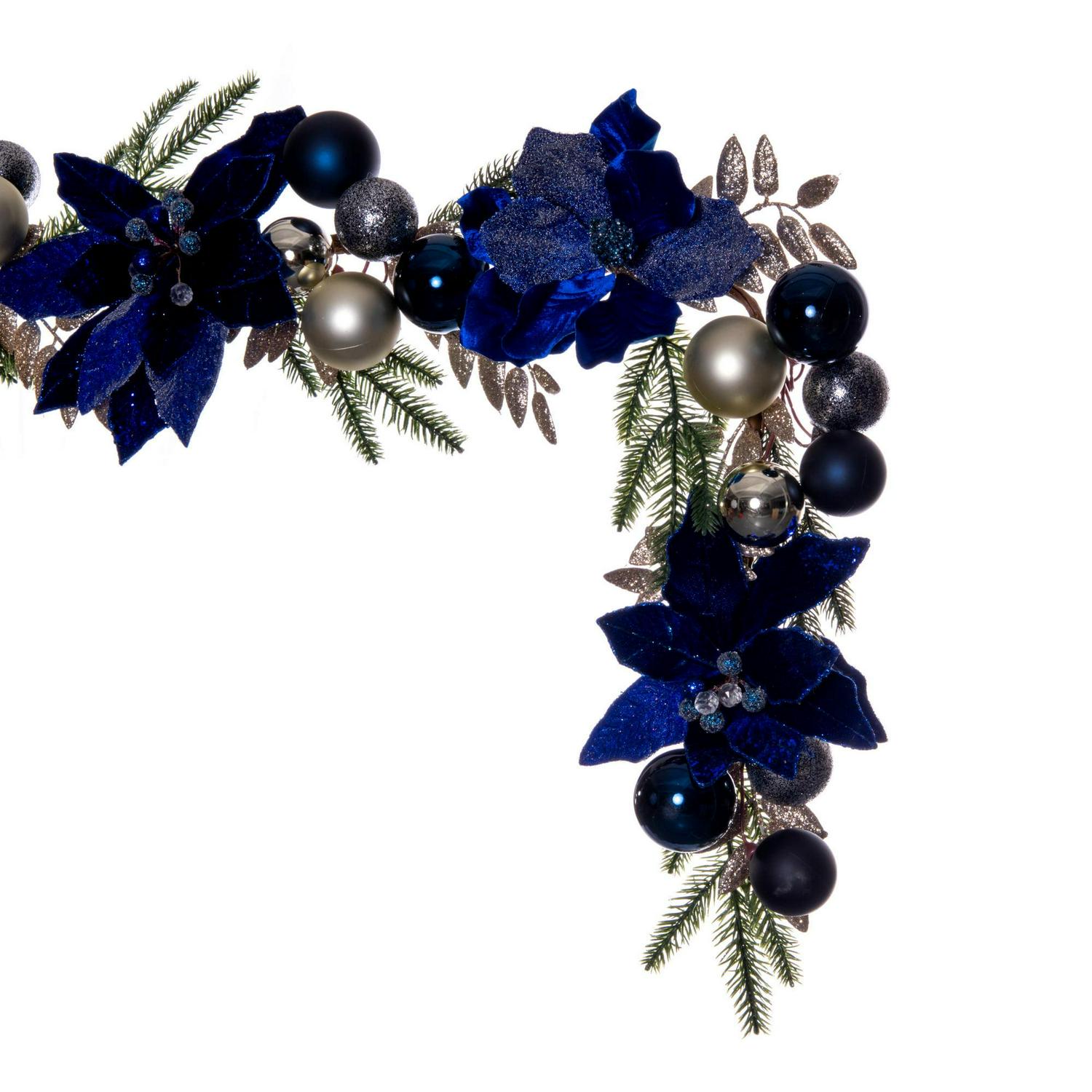 Vickerman 6′ Midnight Blue Magnolia and Poinsettia Leaf Garland. This brilliant artificial Christmas garland is predecorated and features a mixture of blue and silver ornaments that vary in finish, size, and texture. The ornaments on this garland are made with durable shatterproof plastic. The garland is made with a blend of Poinsettias and foliage to create the perfect look. Recommended For Indoor Use Only
