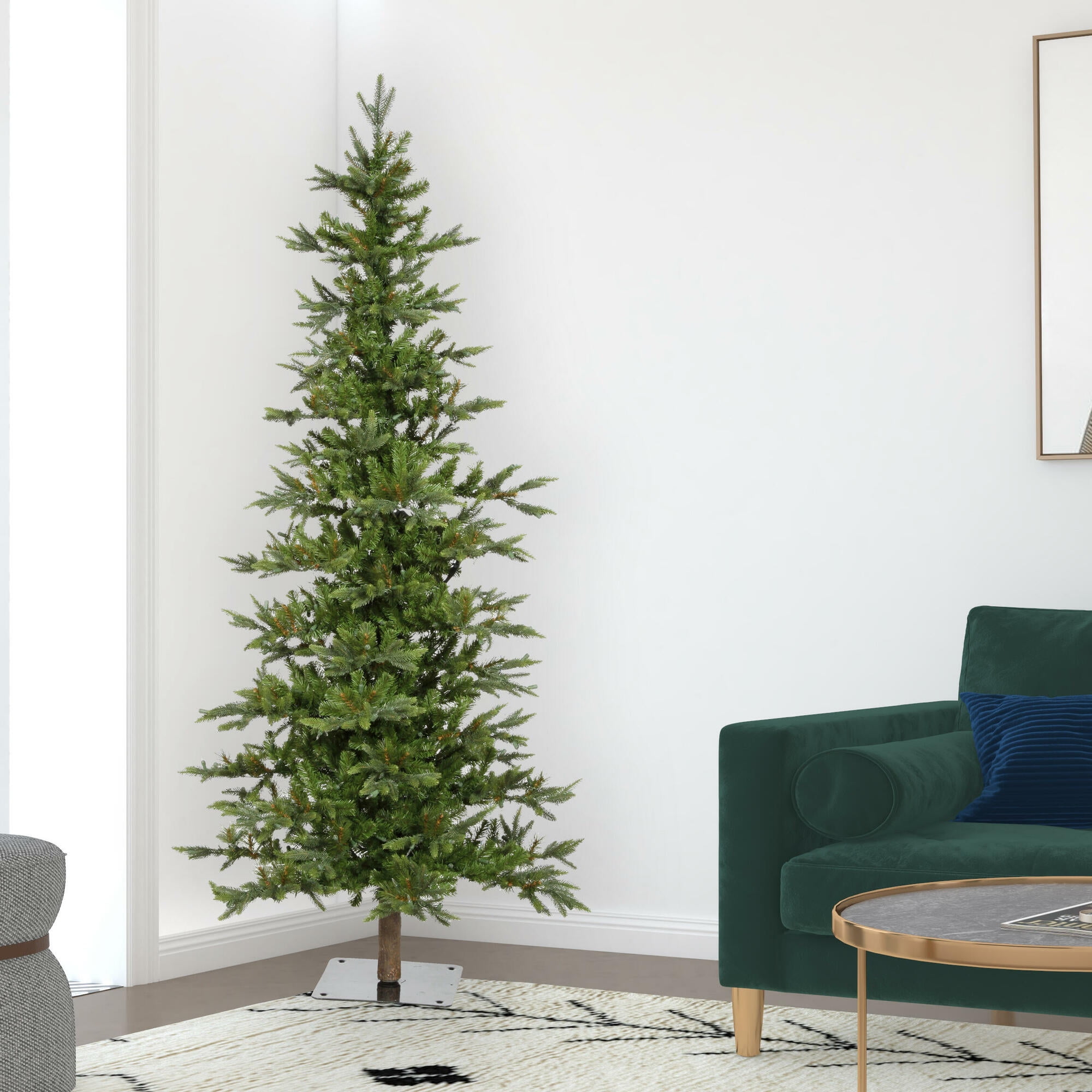 Vickerman 7′ Shawnee Fir Alpine Artificial Christmas Tree with 948 PE Tips. This beautiful tree features a real Wood accented Trunk, comes unlit, and a Flat Metal Stand is included.