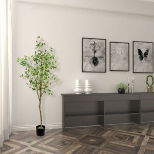 Vickerman 72″ Artificial Potted Milan Leaf Tree. Bring a touch of nature to your home with this 72-inch Tall Potted Faux Milan Leaf Tree, made with realistic leaves and branches. This large faux indoor tree will add elegance and sophistication to your space. The black planters pot provides a sleek and modern base, making this an ideal choice for those who want to add a touch of greenery to their decor. Perfect for indoor use, this maintenance-free large faux tree is easy to keep looking fresh with just a quick wipe of a dry cloth. Whether you’re looking for a tall indoor tree or an artificial floor plant, this potted faux tree will surely add a touch of greenery to your home or office decor.