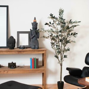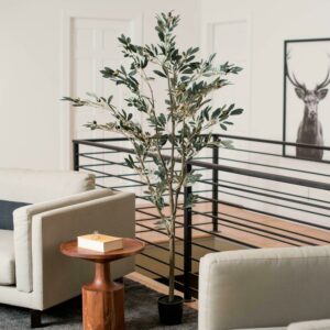 Vickerman 6′ Artificial Potted Olive Tree. Vickerman’s 6-foot Tall Potted Faux Olive Tree takes nature indoors with its realistic features and fine details. Complete with faux olives, this potted faux olive tree is perfect for adding greenery to your decor. With its realistic appearance, this large indoor faux tree is sure to bring a touch of nature into your home. Perfect for indoor use, this maintenance-free tall faux tree is easy to keep looking fresh with just a quick wipe of a dry cloth. Whether you’re looking for a large indoor faux plant or an artificial floor plant, this indoor artificial olive tree is sure to add a touch of greenery to your home or office decor.