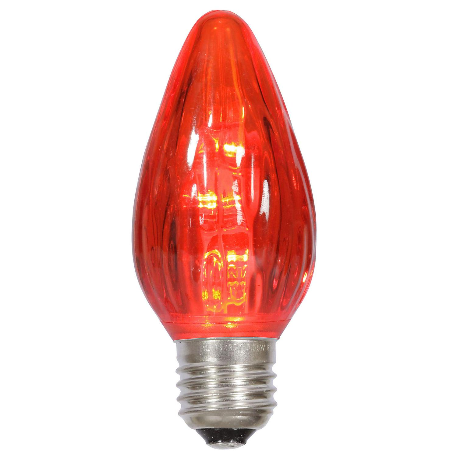 Vickerman F15 Red Plastic LED Flame replacement Bulb. Features: E26 Nickel Base , .96 Watts, 120 Volt, Dimmable, 14 Diodes. Comes as a package of 25 bulbs.