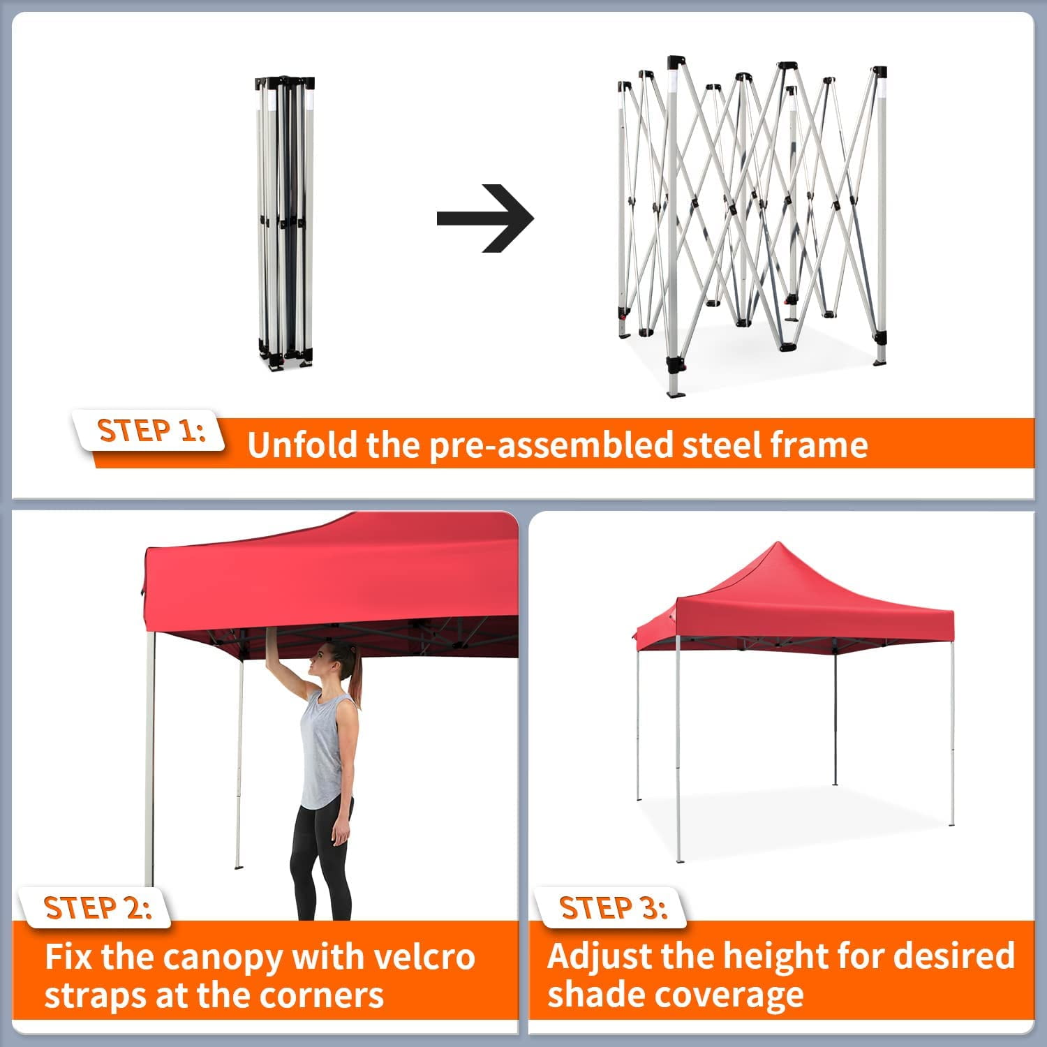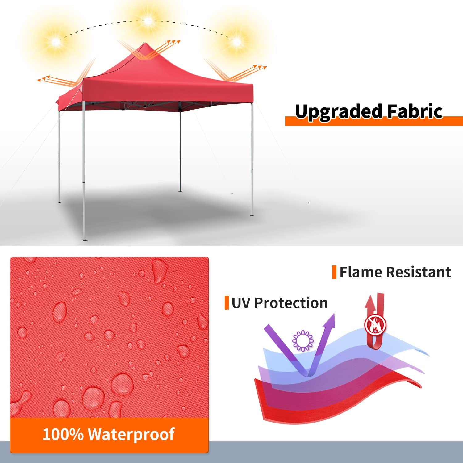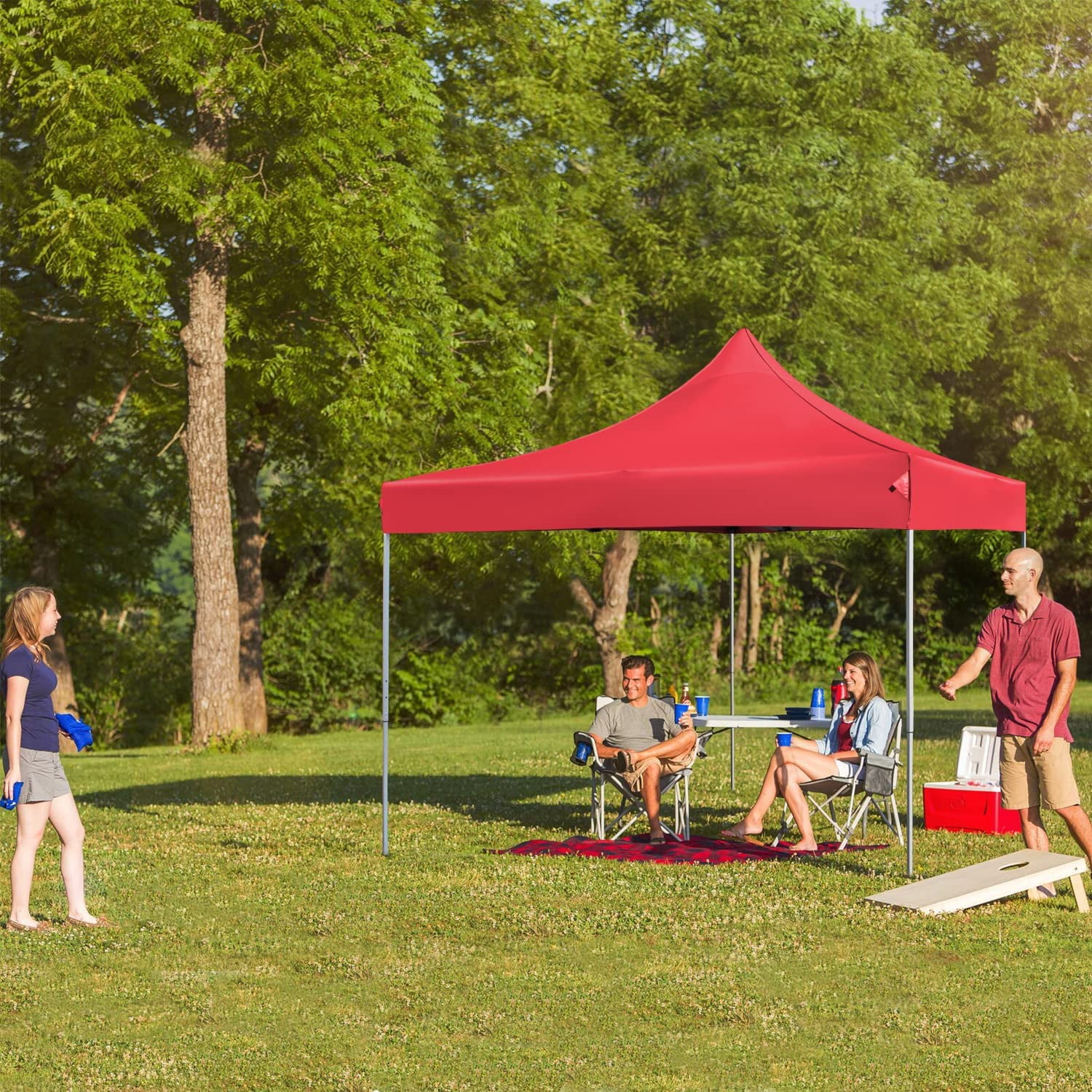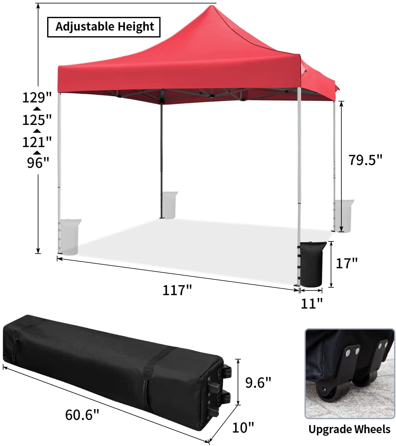 VICTAL 10′ x 10′ Pop-up Canopy with Straight Legs Wedding Party Tent Folding Gazebo Beach Canopy with Carry Bag, Red Made of waterproof & sunfast polyster material, ideal for sunny days or rainy days Constructed by solid steel frame for durability and stability Safe to setup or takedown in one minute by easy push-button mechanism 100 square feet of shade 3-position height adjustable legs, with additional 8′ height Includes a wheeled carry bag Canopy Dimensions: 10 x 10 x 11 feet Rolling Carry Bag Dimensions: 62 x 9 x 9 inches Arrives in one box Package Dimensions: 63 x 10 x 10 inches Shipping Weight: 46.65 lbs 1-Year limited warranty