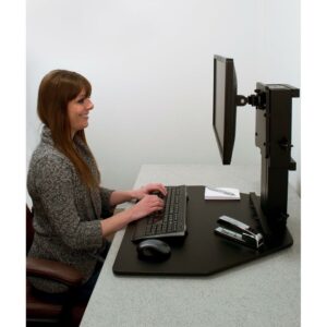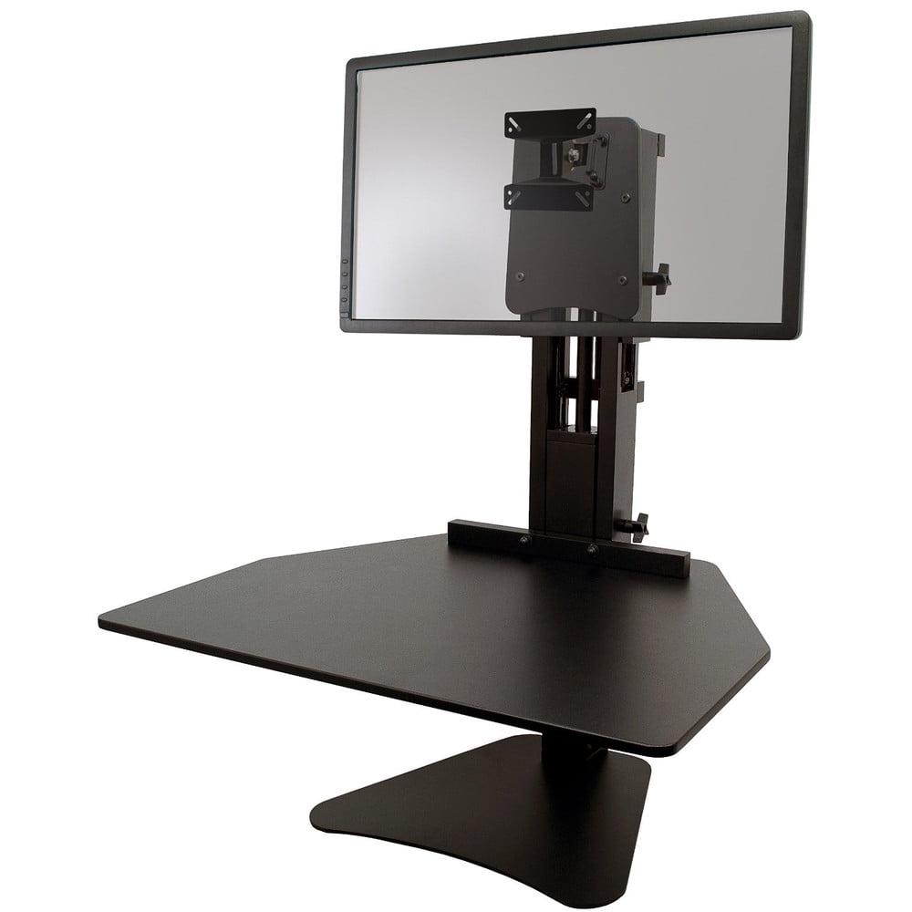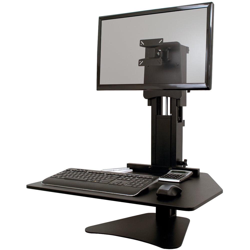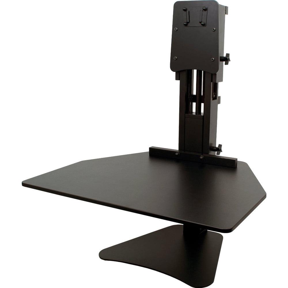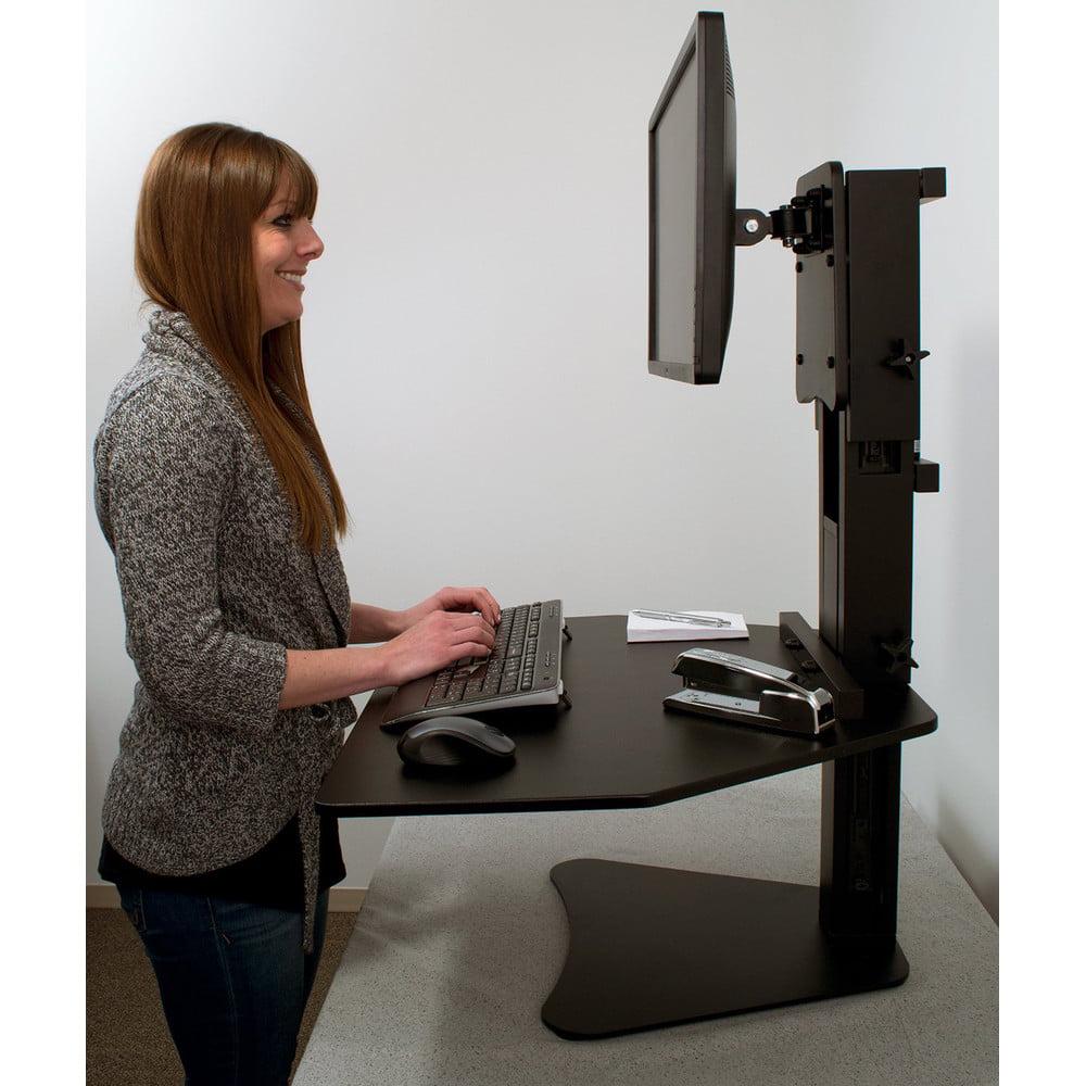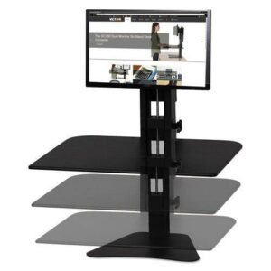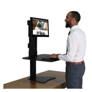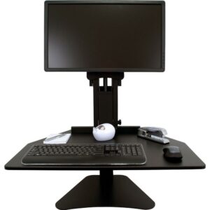 Victor High Rise Manual Standing Desk Workstation – Single Monitor Standing Desk Workstation – 11lb Monitor Capacity – 0″ to 15.5″ Height x 28″ Width x 23″ Depth – Standing Desk – Wood, Steel – Black High Rise Sit-Stand Desk Converter is a simple solution to a common workplace problem: too much sitting. Studies show that sitting for prolonged periods of time is detrimental to your health. Using this converter to stand while you’re working reduces or eliminates the pain you experience from being hunched over your desks and the negative long-term effects of sitting for long hours. It transforms any sit-down desk into a sit or stand-up desk. The 28″ wide x 23″ deep surface is raised up to 15-1/2″ for ergonomic placement of laptop computer, keyboard, mouse or papers while standing. Gas strut design allows easy custom height adjustment of both desk and monitor with the loosening of a knob. Monitor holder is also height-adjustable. For a break from standing, simply push the surface down to desktop level. Sleek wood construction and a durable laminate coating provide years of use. The rear portion of the desk is tapered to fit corner cubicles. Heavy steel base prevents tipping.