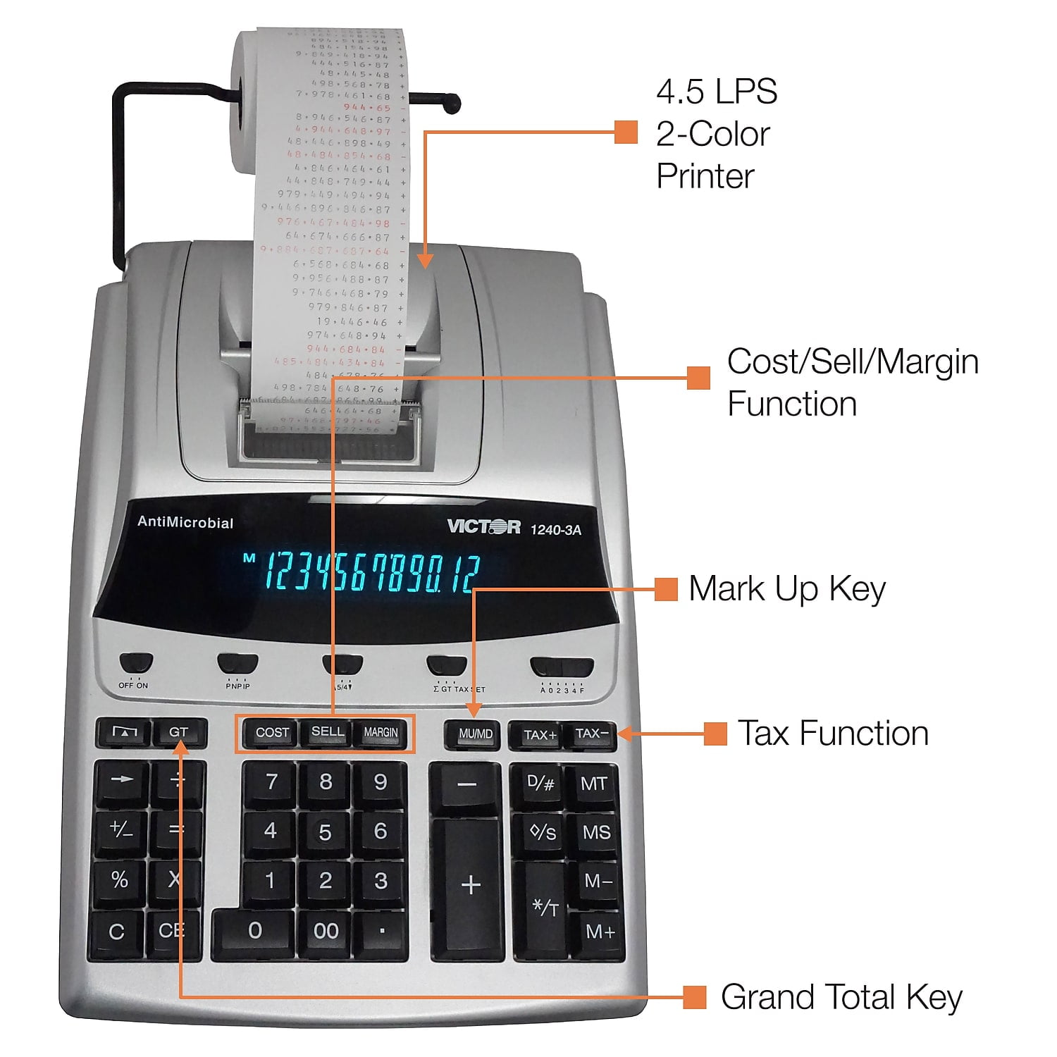 Large 12 Digit Fluorescent Display Heavy Duty Fast 4.5 Lines Per Second 2 Color Printer Manufactured with 45% Recycled Plastic Contemporary Black and Silver Design Mark Up / Gross Profit Margin Automatic Tax Keys Delta Percent CALCULATOR 1240-3A ; 1260-3 ; 1280-7 OEM VICTOR Brand