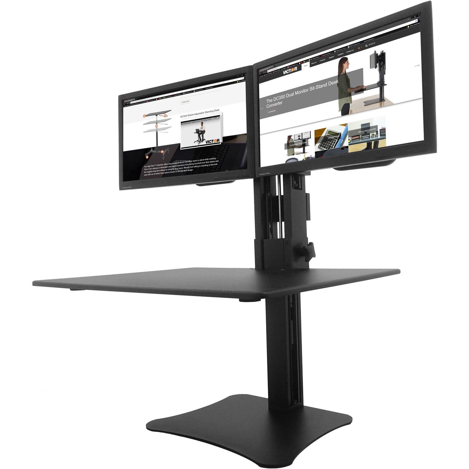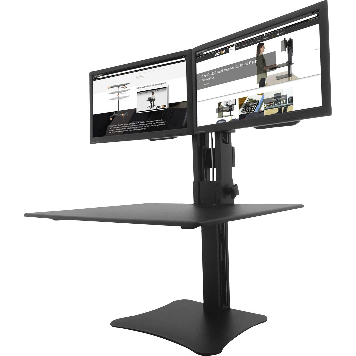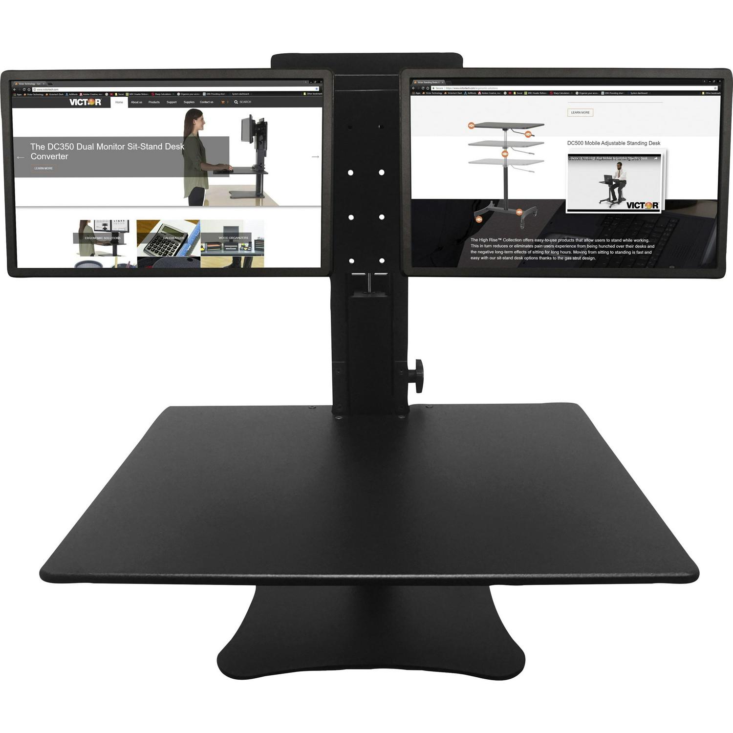 Convert any desk into a more versatile workstation with this Victor Technology DC350 High Rise dual monitor standing desk converter.Work in your preferred posture and multitask more easily with this desk converter, which can hold up to two 24-inch monitors and adjusts from sitting to standing height with the twist of a knob. This Victor Technology High Rise desk converter includes a 23 x 28-inch work surface to keep a keyboard, mouse, notepad or phone easily accessible in either position. Raise your monitor to a comfortable viewing height with this monitor stands. Supports up to 24″ monitors for versatile use. Made of wood and steel for durability. Tilt and swivel functions enable adjustments for comfortable viewing. Each mount securely holds up to 11 lbs. to fit most monitors. Dimensions: 15.5″H x 28″W x 23″D. Black finish adds to its overall aesthetic appeal. 3-year manufacturer limited warranty.Turn your traditional desk into a standing desk with this Victor Technology desk converter. Enjoy the ergonomic design as you work comfortably in a standing position. The modern black design blends in well with many existing desks without the need for any extra mounting tools.Reliable StabilityThe wood construction on this dual-monitor desk converter keeps the unit sturdy, ensuring your computer and other work equipment stays secure. A laminate coating increases the durability of the piece, protecting it from scratches and other damage while giving it a sleek black appearance. The dual-monitor desk converter securely hold monitors up to 22 inches wide so they won’t shift or fall as you raise or lower the converter. Convenient UsePlace the converter on top of your existing desk with no need to clamp or attach it for immediate use and no damage inflicted to your desk. Adjust this sit-stand desk converter to just the right height with the gas strut adjustment. Lower it to sit at the desk, or raise it to stand and work with a simple knob adjustment. The spacious desk…