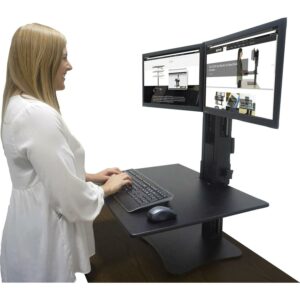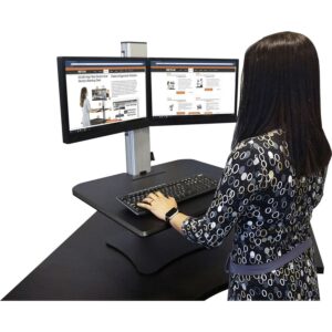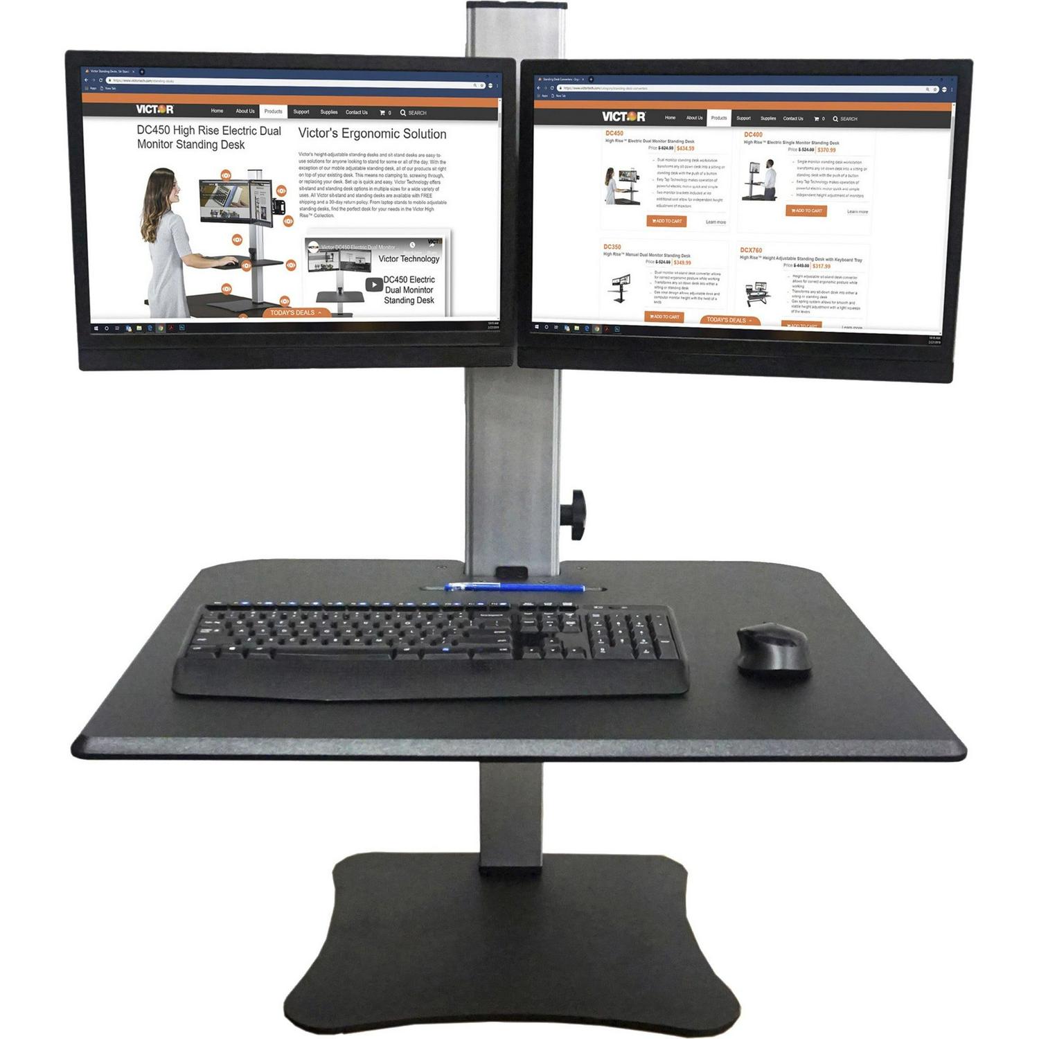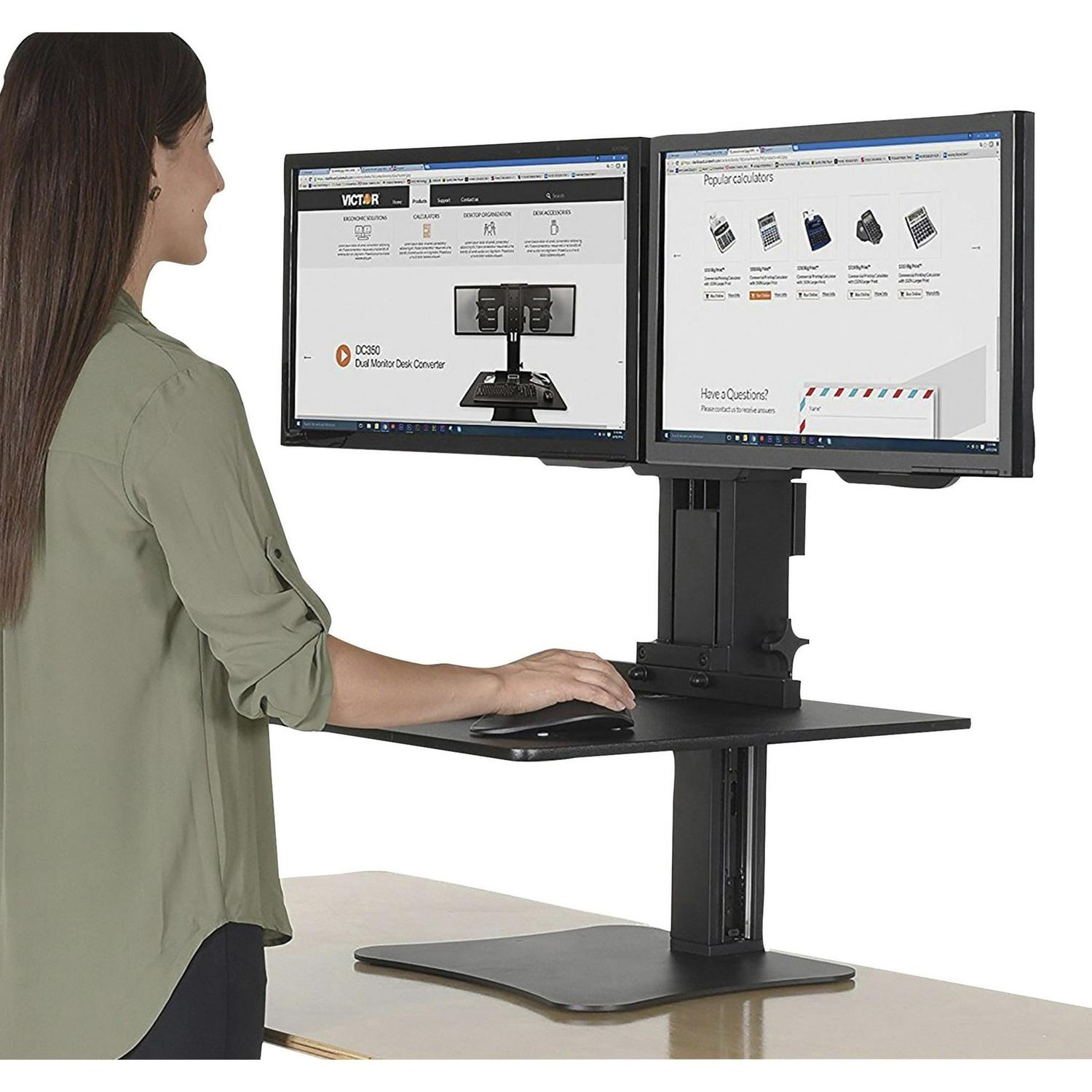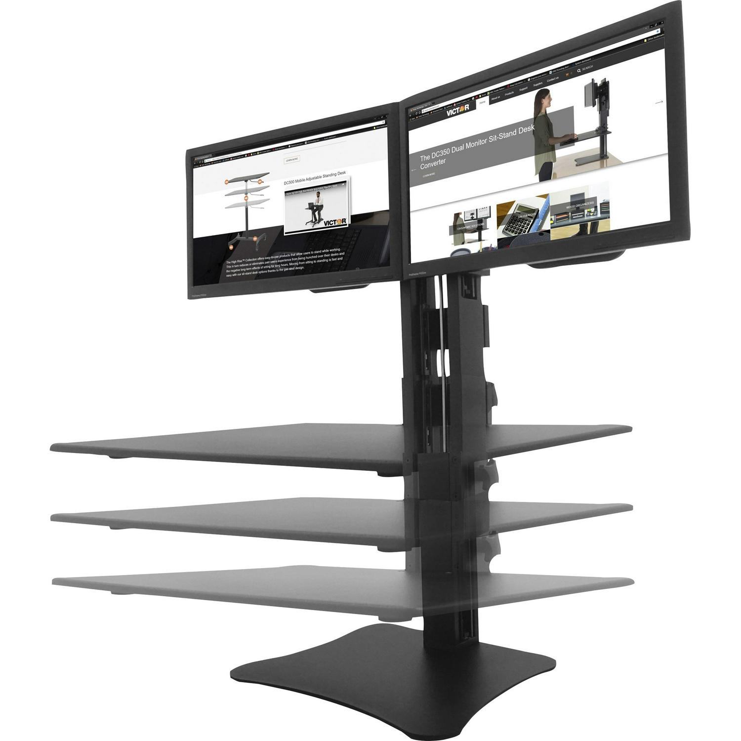 Convert any desk into a more versatile workstation with this Victor Technology DC350 High Rise dual monitor standing desk converter.Work in your preferred posture and multitask more easily with this desk converter, which can hold up to two 24-inch monitors and adjusts from sitting to standing height with the twist of a knob. This Victor Technology High Rise desk converter includes a 23 x 28-inch work surface to keep a keyboard, mouse, notepad or phone easily accessible in either position. Raise your monitor to a comfortable viewing height with this monitor stands. Supports up to 24″ monitors for versatile use. Made of wood and steel for durability. Tilt and swivel functions enable adjustments for comfortable viewing. Each mount securely holds up to 11 lbs. to fit most monitors. Dimensions: 15.5″H x 28″W x 23″D. Black finish adds to its overall aesthetic appeal. 3-year manufacturer limited warranty.Turn your traditional desk into a standing desk with this Victor Technology desk converter. Enjoy the ergonomic design as you work comfortably in a standing position. The modern black design blends in well with many existing desks without the need for any extra mounting tools.Reliable StabilityThe wood construction on this dual-monitor desk converter keeps the unit sturdy, ensuring your computer and other work equipment stays secure. A laminate coating increases the durability of the piece, protecting it from scratches and other damage while giving it a sleek black appearance. The dual-monitor desk converter securely hold monitors up to 22 inches wide so they won’t shift or fall as you raise or lower the converter. Convenient UsePlace the converter on top of your existing desk with no need to clamp or attach it for immediate use and no damage inflicted to your desk. Adjust this sit-stand desk converter to just the right height with the gas strut adjustment. Lower it to sit at the desk, or raise it to stand and work with a simple knob adjustment. The spacious desk…