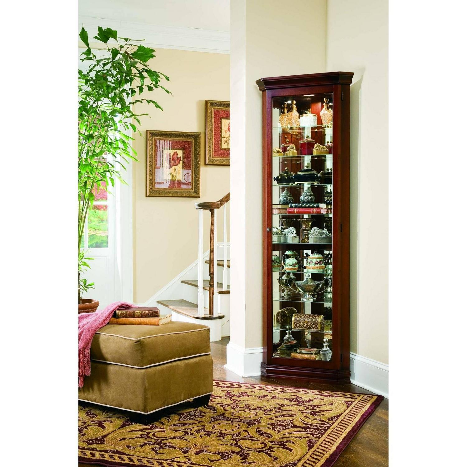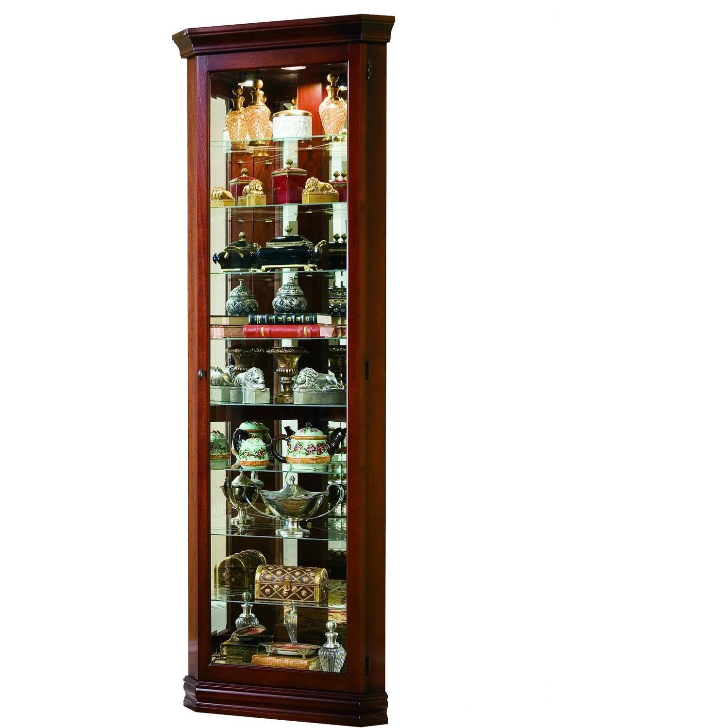 In just 16 inches of wall space, this curio allows you to maximize space and bring art and light into a room. That is smart design. The traditional curio features classic moldings, canted corners, and incised glass. It is built of select hardwood solidsveneers with a rich Victorian Cherry finish. This curio includes a lighted interior, mirror back, and adjustable glass shelves with plate grooves.
