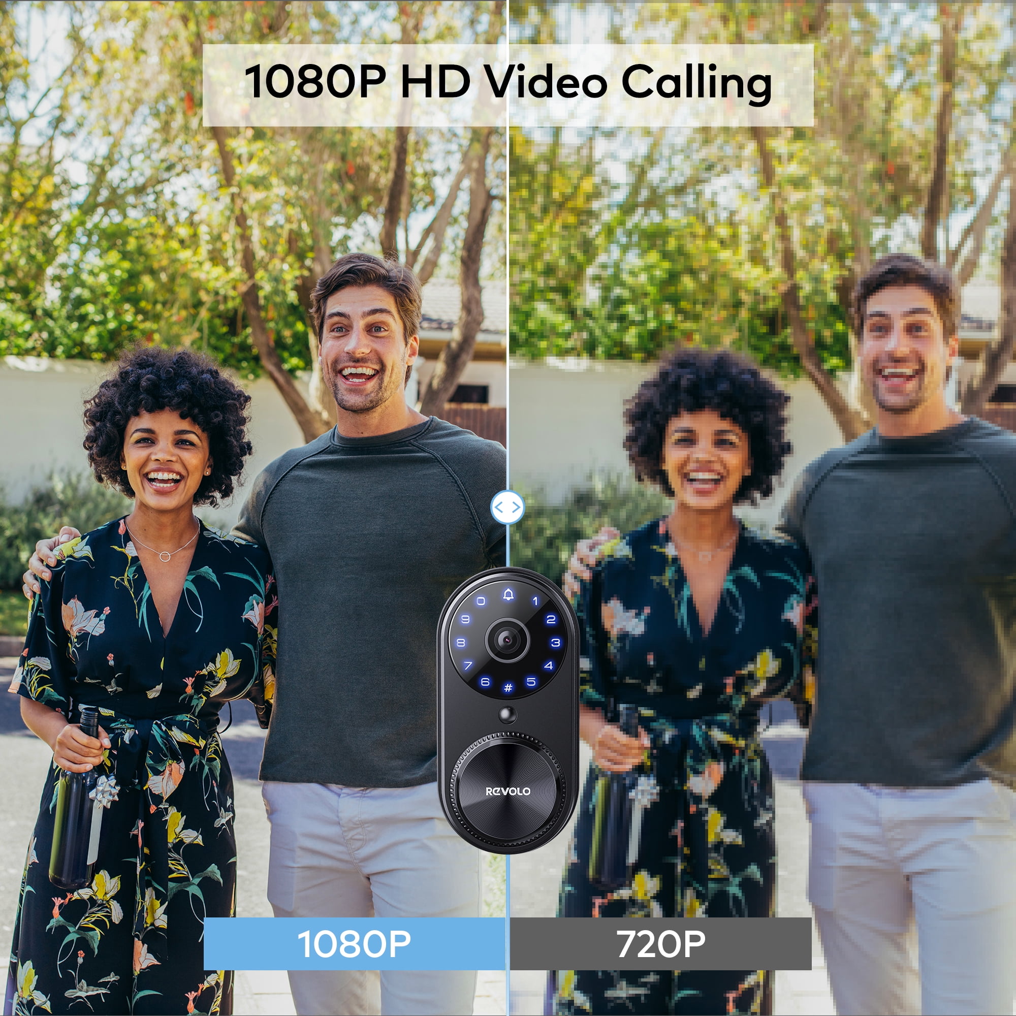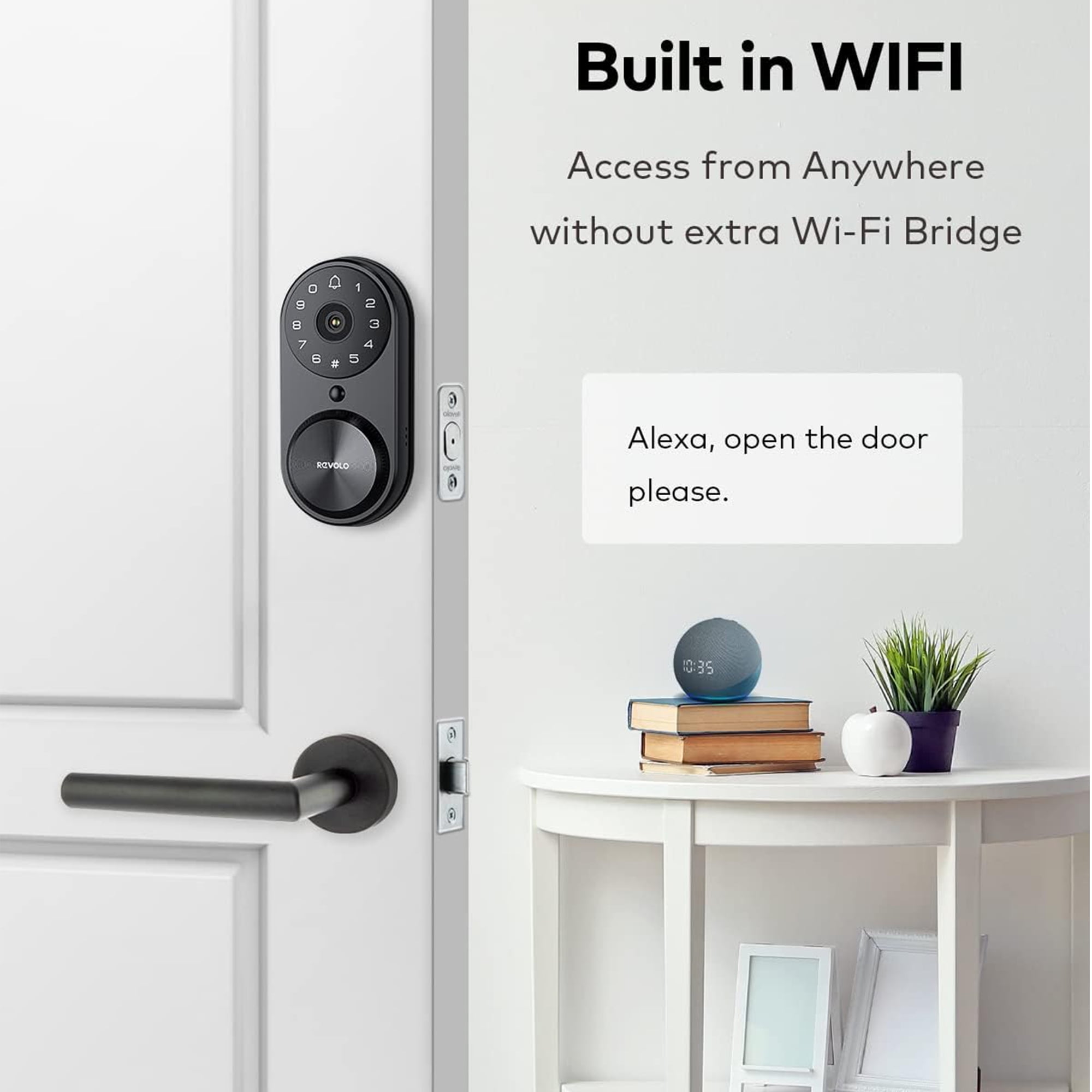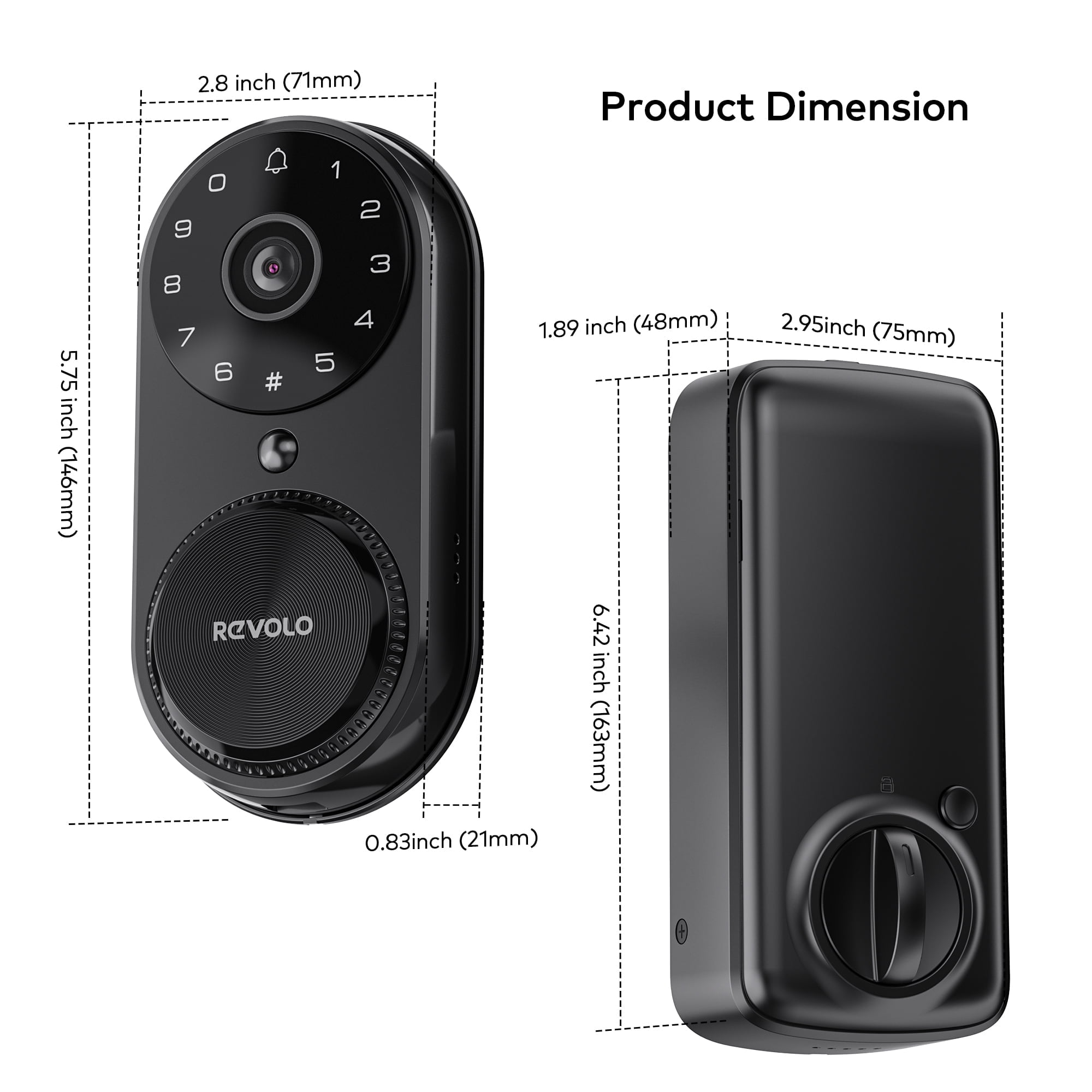 Specifictatioins: Product Type: Deadbolt Keypad Type: Touchpad Unlocked Type: Mechanical, Pin-code/App/Voice Auto Locking: Yes One Key Locking: Yes Doorbell: Yes Camera: 1080P Code Quantity: 20 Remotely Control: Yes Record: Yes Two Way Video Call: Yes Voice Control: Alexa/Google Assistant Main Material: Aluminum Alloy Color: Matte Black Hardware Lock Type: Wifi Deadbolt Lock Bolt Type: Standard Deadbolt Field of view: 66° horizontal, 121° vertical Working Voltage: DC 7.4V Battery: Polymer Lithium Batteries Working Temperature: -35-66℃ Emergency Power: 5V Type C USB RH(%): 20-90% Connection: 2.4G&5GHZ WiFi/Bluetooth Door Category: Wood Door Thickness: 1.38″-1.97″(35mm-50mm) Door Pre Size: 1.5″/2.12″ (38mm/54mm) IP Rating: IP65 Door Thickness: 1.38″-2″ Door Hole Width: 1.5″-2.1″ Hold Center to Door:2.4″-2.8″ Backset: 2.4″-2.8″ Front Panel Thickness:1.89″ Back Panel Thickness: 0.83″ Front Panel Dimension: 6.42″LX2.8″W Back Panel Dimension: 5.75”LX2.95″W Item Weight: 4.25lbs Finish:Matte Black Locking Type: App Control Method: App Controlled Type: Amazon Alexa and Google Home(Only support 2.4GHz Connectivity) Battery Included: Yes Door Type: Wood door, Security door, Copper door, Stainless steel door Usage:Office, Apartment, School, Garage, Airbnb, Rental Return Policy: 30-Day hassle-free purchase, 2-Year product promise and lifetime customer support Package Included: 1xRevolo Wi-Fi Smart Video Lock 1xLatch 2x Machanical Key 1xStrike Plate 1xScrews Kits 1xBattary 1xInstallation Instructions