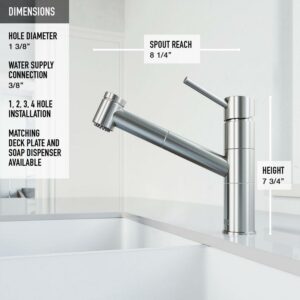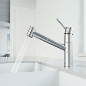 The VIGO Branson Pull-Out Spray Kitchen Faucet brings modern freshness to any sized kitchen with its sleek lines and low profile. This functional faucet features a dual action, pull-out spray head and 360° swivel spout that is extendable up to 30 inches. Solid brass construction and corrosion resistant finish ensure durability.