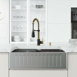 Upgrade your kitchen with the VIGO Brant pull-down kitchen faucet with sprayer. The sleek single lever and intricate coil design add a touch of elegance to any kitchen decor. The dual-function spray head allows for a powerful spray or an aerated flow, and the pull-down hose extends up to 30 inches for easy cleaning. This spray kitchen faucet also features a 360-degree swivel spout for added convenience. Pair with any stainless, undermount, or farmhouse kitchen sink to complete your modern kitchen design.