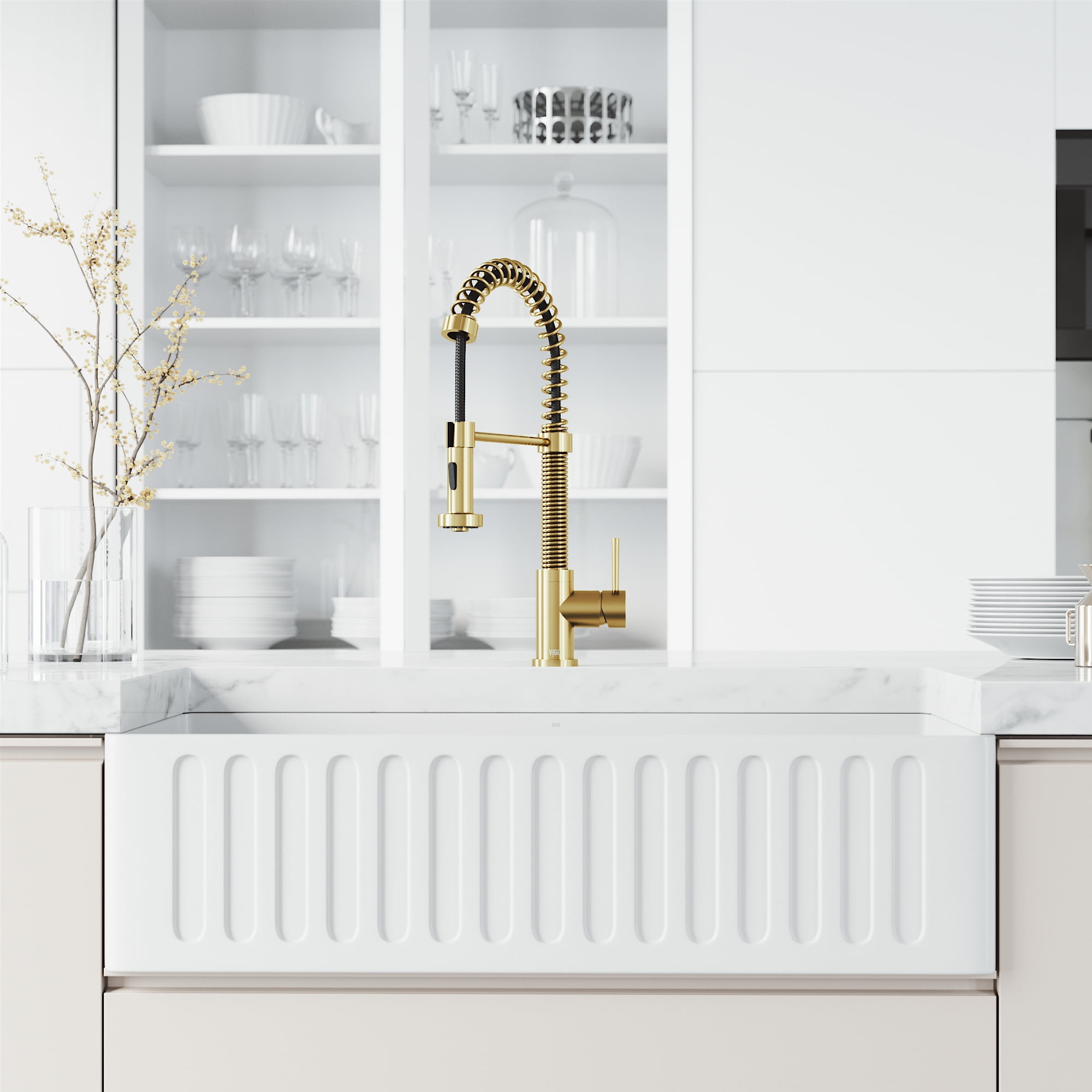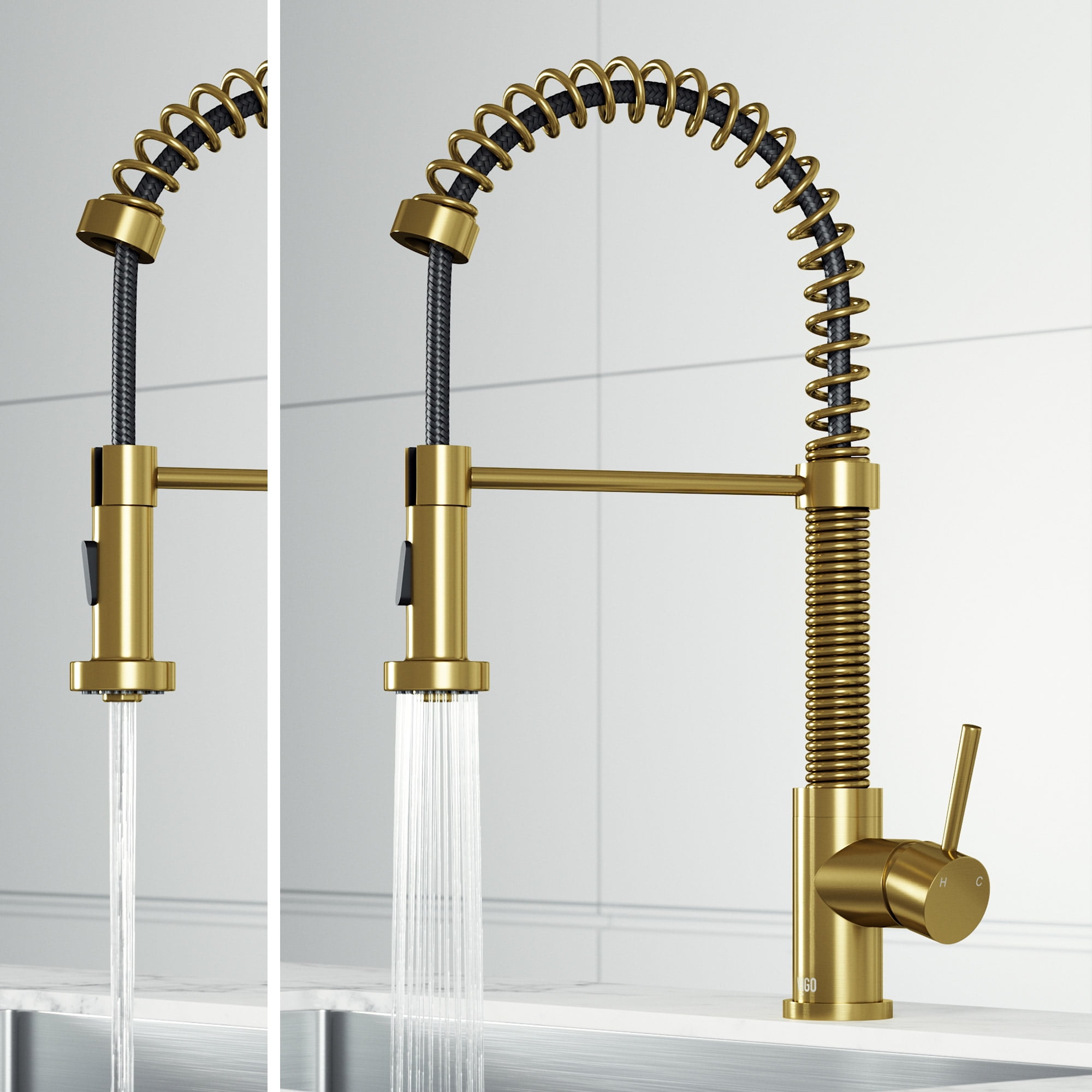 The pull-down, dual action spray head on the VIGO Edison Pull-Down Spray Kitchen Faucet allows for your choice of aerated flow or powerful spray for all your modern kitchen needs. The 360° swivel spout extends up to 30 in. for ease of use and maneuverability. With spiral details and a solid brass construction, the Edison kitchen faucet is sure to be an immediate favorite in your home.